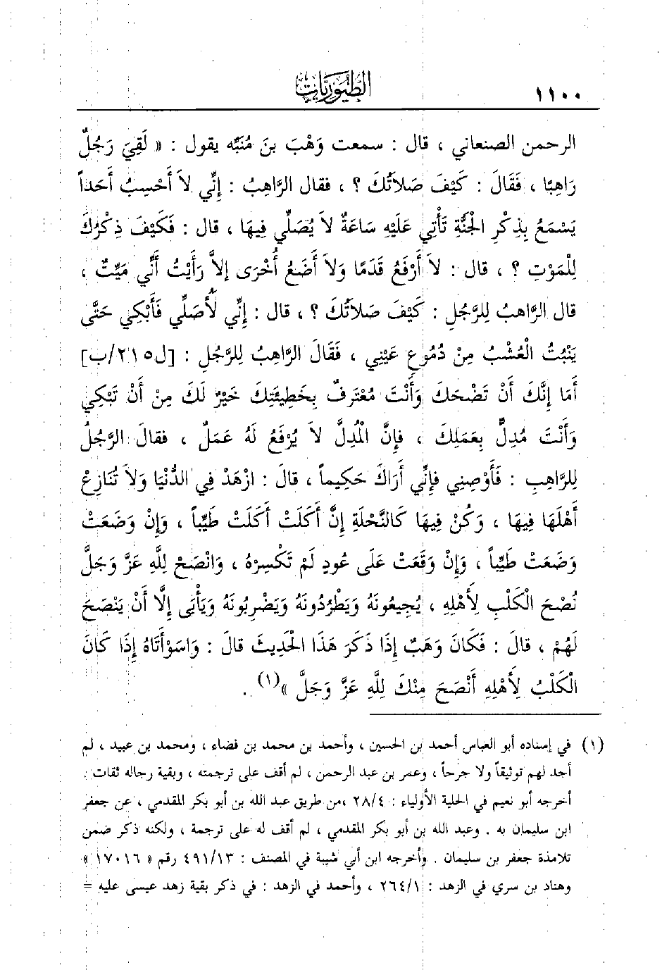 الرحمن الصنعاني، قال: سمعت وَهْبَ بنَ مُنَبِّه يقول: ((لَقِيَ رَجُلٌ رَاهِبًا، فَقَالَ: كَيْفَ صَلاَتُكَ؟، فقال الرَّاهِبُ: إِنِّي لاَ أَحْسِبُ أَحَداً يَسْمَعُ بِذِكْرِ الْجَنَّةِ تَأْتِي عَلَيْهِ سَاعَةٌ لاَ يُصَلِّي فِيهَا، قال: فَكَيْفَ ذِكْرُكَ لِلْمَوْتِ؟، قال: لاَ أَرْفَعُ قَدَمًا وَلاَ أَضَعُ أُخْرَى إلاَّ رَأَيْتُ أَنِّي مَيِّتٌ، قال الرَّاهبُ لِلرَّجُلِ: كَيْفَ صَلاَتُكَ؟، قال: إِنِّي َلأُصَلِّي فَأَبْكِي حَتَّى يَنْبُتُ الْعُشْبُ مِنْ دُمُوعِ عَيْنِي، فَقَالَ الرَّاهِبُ لِلرَّجُلِ: [ل215/ب] أَمَا إِنَّكَ أَنْ تَضْحَكَ وَأَنْتَ مُعْتَرفٌ بِخَطِيئَتِكَ خَيْرٌ لَكَ مِنْ أَنْ تَبْكِي وَأَنْتَ مُدِلٌّ بِعَمَلِكَ، فإِنَّ الْمُدِلَّ لاَ يُرْفَعُ لَهُ عَمَلٌ، فقالَ الرَّجُلُ لِلرَّاهِبِ: فَأَوْصِنِي فإِنِّي أَرَاكَ حَكِيماً، قالَ: ازْهَدْ فِي الدُّنْيَا وَلاَ تُنَازِعْ أَهْلَهَا فِيهَا، وَكُنْ فِيهَا كَالنَّحْلَةِ إِنَّ أَكَلَتْ أَكَلَتْ طَيِّباً، وَإِنْ وَضَعَتْ وَضَعَتْ طَيِّباً، وَإِنْ وَقَعَتْ عَلَى عُودٍ لَمْ تَكْسِرْهُ، وَانْصَحْ لِلَّهِ عَزَّ وَجَلَّ نُصْحَ الْكَلْبِ ِلأَهْلِهِ، يُجِيعُونَهُ وَيَطْرُدُونَهُ وَيَضْرِبُونَهُ وَيَأْبَى إِلاَّ أَنْ يَنْصَحَ لَهُمْ، قالَ: فَكَانَ وَهَبٌ إِذَا ذَكَرَ هَذَا الْحَدِيثَ قالَ: وَاسَوْأَتَاهُ إِذَا كَانَ الْكَلْبُ ِلأَهْلِهِ أَنْصَحَ مِنْكَ لِلَّهِ عَزَّ وَجَلَّ)) (¬1)