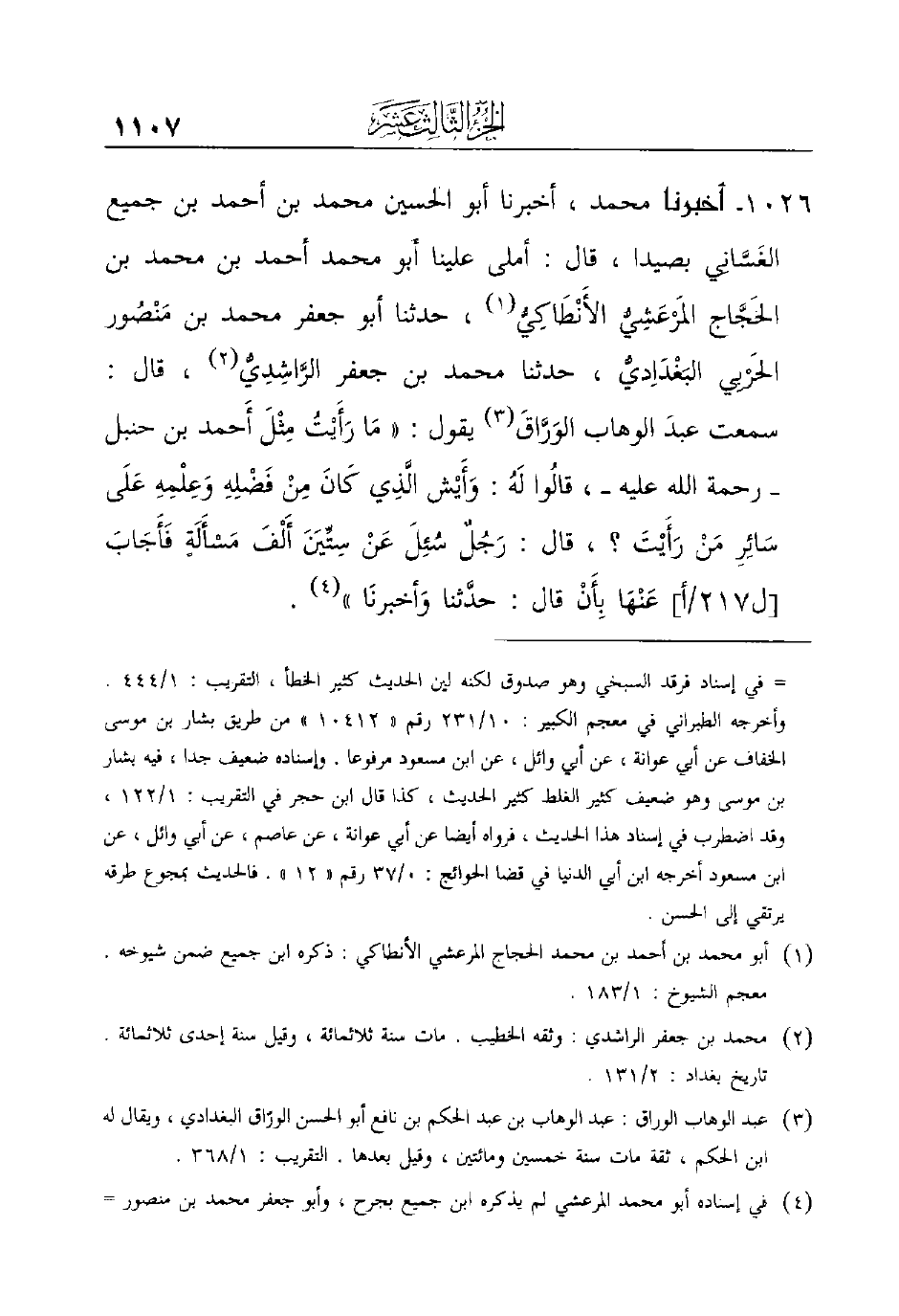1026 - أخبرنا محمد، أخبرنا أبو الحسين مُحَمَّدُ بْنُ أَحْمَدَ بْنِ جُمَيْعٍ الغَسَّانِي بصيدا، قال: أملى علينا أبو محمد أحمد بن محمد بن الحَجَّاج المَرْعَشِيُّ الأَنْطَاكِيُّ (¬1) ، حَدَّثَنَا أَبُو جَعْفَرٍ مُحَمَّدُ بْنُ مَنْصُور الحَرْبِي البَغْدَاِديُّ، حدثنا محمد ابن جعفر الراَّشِدِيُّ (¬2) ، قال: سمعت عبدَ الوهاب الوَرَّاقَ (¬3) يقول: ((مَا رَأَيْتُ مِثْلَ أَحمد بن حنبل ـ رحمة الله عليه ـ، قالُوا لَهُ: وَأَيْش الَّذِي كَانَ مِنْ فَضْلِهِ وَعِلْمِهِ عَلَى سَائِرِ مَنْ رَأَيْتَ؟، قال: رَجُلٌ سُئِلَ عَنْ سِتِّيَنَ أَلْفَ مَسْأَلَةٍ فَأَجَابَ [ل217/أ] عَنْهَا بِأَنْ قال: حدَّثنا وَأخبرنَا)) (¬4)