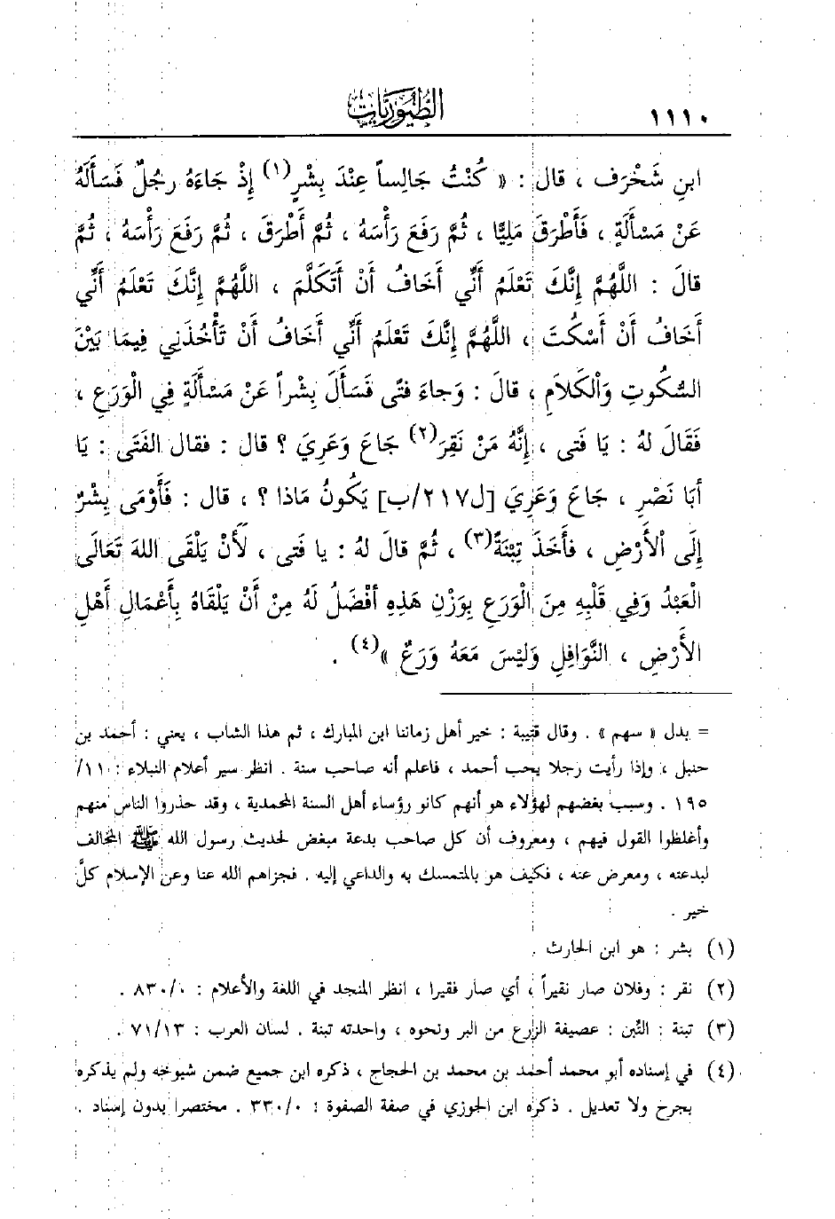 بنِ شَحْرَف، قال: ((كُنْتُ جَالِساً عِنْدَ بِشْرٍ (¬1) إِذْ جَاءَهُ رجُلٌ فَسَأَلَهُ عَنْ مَسْأَلَةٍ، فَأَطْرَقَ مَلِيًّا، ثُمَّ رَفَعَ رَأْسَهُ، ثُمَّ أَطْرَقَ، ثُمَّ رَفَعَ رَأْسَهُ، ثُمَّ قالَ: اللَّهُمَّ إِنَّكَ تَعْلَمُ أَنِّي أَخَافُ أَنْ أَتَكَلَّمَ، اللَّهُمَّ إِنَّكَ تَعْلَمُ أَنِّي أَخَافُ أَنْ أَسْكُتَ، اللَّهُمَّ إِنَّكَ تَعْلَمُ أَنِّي أَخَافُ أَنْ تَأْخُذَنِي فِيمَا بَيْنَ السُّكُوتِ وَاْلكَلاَمِ، قالَ: وَجاءَ فتى فَسَأَلَ بِشْراً عَنْ مَسْأَلَةٍ فِي الْوَرَعِ، فَقَالَ لهُ: يَا فَتًى، إِنَّهُ مَنْ نَقِرَ (¬2) جَاعَ وَعَرِيَ؟ قال: فقال الفَتَى: يَا أبَا نَصْرِ، جَاعَ وَعَرِيَ [ل217/ب] يَكُونُ مَاذا؟، قال: فَأَوْمَى بِشْرٌ إِلَى اْلأَرْضِ، فأَخَذَ تِبْنَةً (¬3) ، ثُمَّ قالَ لهُ: يا فَتى، َلأَنْ يَلْقَى اللهَ تَعَالَى الْعَبْدُ وَفِي قَلْبِهِ مِنَ الْوَرَعِ بِوَزْنِ هَذِهِ أفْضَلُ لَهُ مِنْ أَنْ يَلْقَاهُ بِأَعْمَالِ أَهْلِ الأَرْضِ، النَّوَافِلِ وَليْسَ مَعَهُ وَرَعٌ)) (¬4) .
