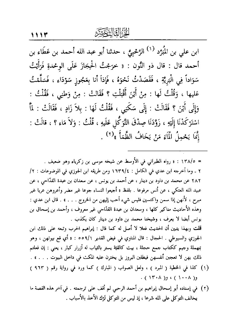 بْنُ علي ابن المُبَرِّد (¬1) الرَّحْبِيُّ، حدثنا أبو عبد الله أحمد بن عَطَاء بن أحمد قال: قال ذو النُّون: ((خرَجْتُ الْحِجَازَ عَلَى الوِحْدةِ فَرَأَيْتُ سَوَاداً فِي الْبَرِيَّةِ، فَقَصَدْتُ نَحْوَهُ، فَإذاَ أنا بِعَجُوزٍ سَوْدَاء، فَسَلَّمْتُ عَليها، وَقُلْتُ لَها: مِنْ أَيْنَ أَقْبَلْتِ؟ فَقَالتْ: مِنْ وَطَنِي، فَقُلْتُ: وَإِلَى أَيْنَ؟ فَقَالَتْ: إِلَى سَكَنِي، فَقُلْتُ لَهَا: بِلاَ زَادٍ، فَقَالَتْ: لمَاَّ اسْتَرْكَدْنَا إِلَيْهِ، زَوَّدَنَا صِدْقَ التَّوَكُّلِ عَلَيهِ، قُلْتُ: وَلاَ مَاء؟، قالَتْ: إِنَّمَا يَحْمِلُ الْمَاءَ مَنْ يَخَافُ الظَّمَأَ)) (¬2) .