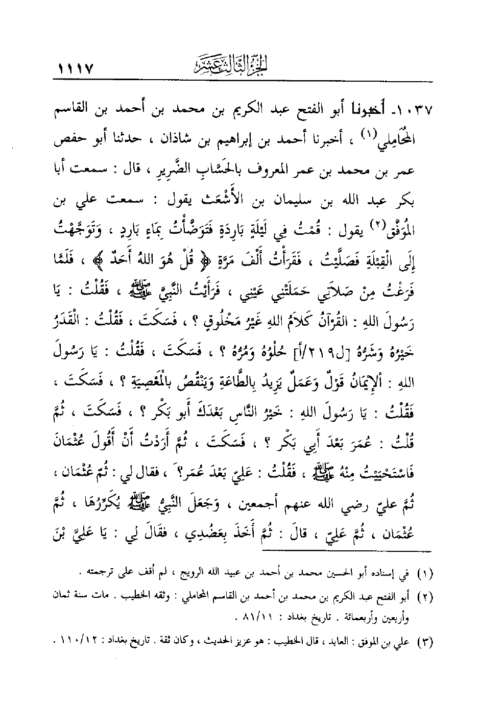 1037 - أخبرنا أبو الفتح عبد الكريم بن محمد بن أحمد بن القاسم المُحَامِلي (¬1) ، أخبرنا أحمد بن إبراهيم بن شاذان، حدثنا أبو حفص عمر بن محمد بن عمر المعروف بالحَسَّابِ الضَّرِيرِ، قال: سمعت أبا بكر عبد الله بن سليمان بن الأَشْعَث يقول: سمعت علي ابن المُوَفَّق (¬2)