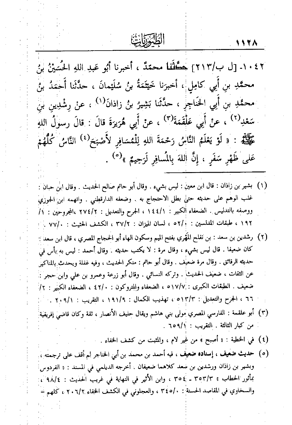1042 -[ل ب/213] حدَّثَنا محمّدٌ، أَخْبَرَنَا أبُو عَبدِ اللهِ الحُسَيْنُ بنُ محمَّدِ بنِ أَبِي كامِلٍ، أخبرَنا خَيْثَمَةُ بنُ سُلَيْمانَ، حدَّثَنا أَحمَدُ بنُ محمَّدِ بنِ أَبِي الخَناجِرِ، حدَّثَنا بَشِيرُ بنُ زاذانَ (¬1) ، عنْ رِشْدِينِ بنِ سَعْدِ (¬2) ، عنْ أَبِي عَلْقَمَةَ (¬3) ، عنْ أَبِي هُرَيرَةَ قالَ: قالَ رسولُ اللهِ صلَّى اللهُ عَلَيهِ وَسَلَّمَ: ((لَوْ يَعْلَمُ النَّاسُ رَحْمَةَ اللهِ لِلْمُسَافِرِ لأَصْبَحَ (¬4) النَّاسُ كُلُّهُمْ عَلى ظَهْرِ سَفَرٍ، إِنَّ اللهَ بِالمُسافِرِ لَرَحِيمٌ)) (¬5)