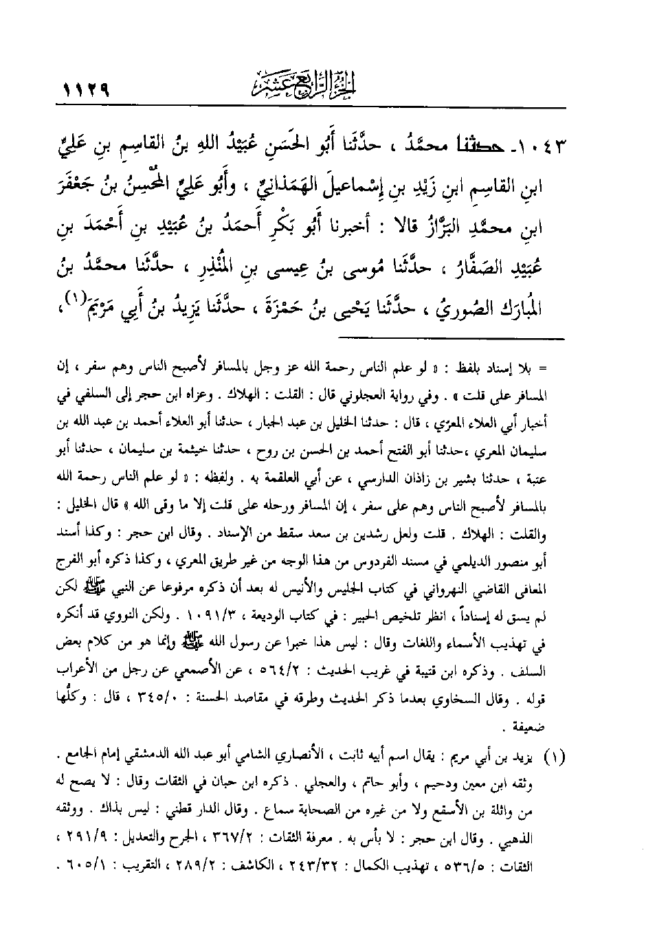 1043 - حَدَّثَنَا محمَّدُ، حدَّثَنا أَبُو الحَسَنِ عُبَيْدُ اللهِ بنُ القاسِمِ بنِ عَلِيِّ بنِ القاسِمِ ابنِ زَيْدِ ابنِ إِسْماعيلَ الهَمَذانِيِّ، وأَبُو عَلِيِّ المُحْسِنُ بنُ جَعْفَرَ بنِ محمَّدِ البَزَّازُ قَالا: أَخْبَرَنَا أَبُو بَكْرِ أَحمَدُ ابنُ عُبَيْدِ بنِ أَحْمَدَ بنِ عُبَيْدِ الصَفَّارُ، حدَّثَنا مُوسى بنُ عِيسى ابنِ المُنْذِرِ، حدَّثَنا محمَّدُ بنُ المُبارَك الصُوريُ، حدَّثَنا يَحْيى بنُ حَمْزَةَ، حدَّثَنا يَزِيدُ بنُ أَبِي مَرْيَمَ (¬1) ،