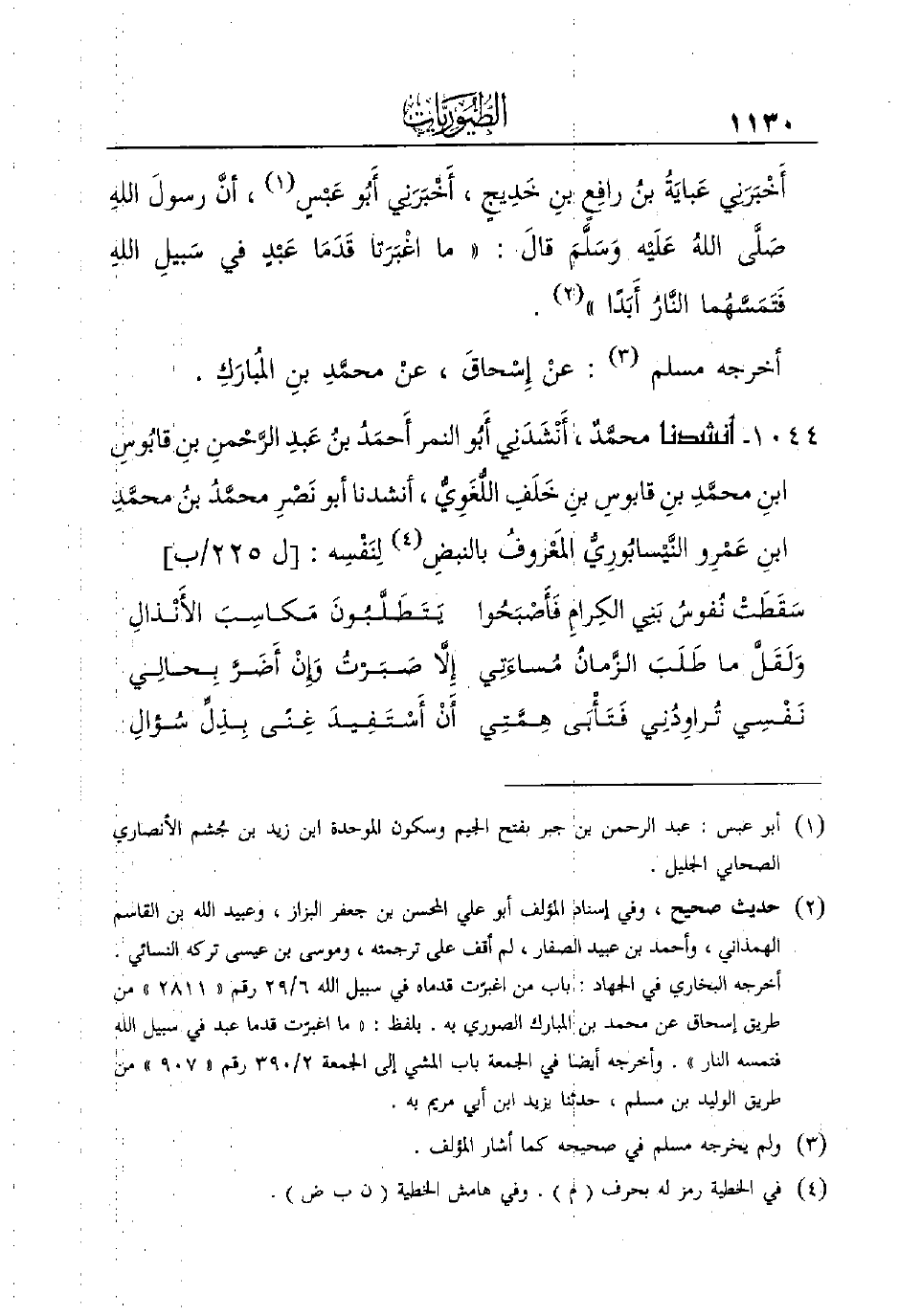 ابن المبارك الصوري به. بلفظ: ((ما اغبرّت قَدَمَا عَبْدٍ فِي سَبِيلِ اللَّهِ فتمسه النار)) .