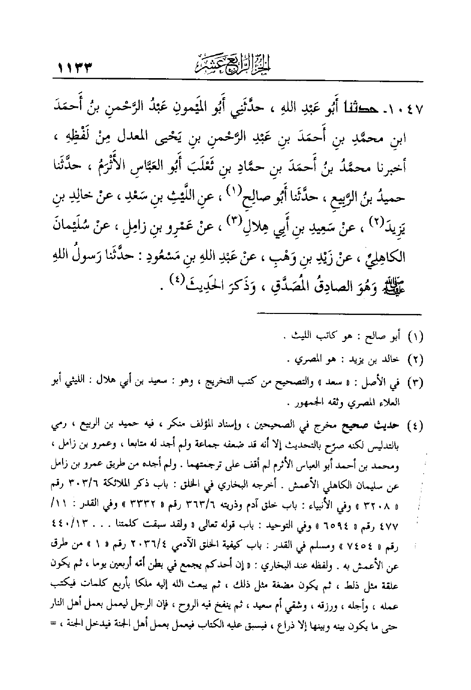 أَبُو العَبَّاسِ الأَثْرَمُ، حدَّثَنا حميدُ بنُ الرَّبِيعِ، حدَّثَنا أَبُو صالِحِ (¬1) ، عنِ اللَّيْثِ بنِ سَعْدِ، عنْ خالِدِ ابنِ يَزِيدَ (¬2) ، عنْ سَعِيدِ بنِ أَبِي هِلالِ (¬3) ، عنْ عَمْرِو بنِ زامِلِ، عنْ سُلَيْمانَ الكاهِلِيِّ، عنْ زَيْدِ ابنِ وَهْبِ، عنْ عَبْدِ اللهِ بنِ مَسْعُودِ: حدَّثَنا رَسولُ اللهِ صَلَّى اللهُ عَلَيهِ وَسَلَّمَ وَهُوَ صادِقُ المُصَدَّقِ، وَذَكرَ الحَدِيثَ (¬4) .