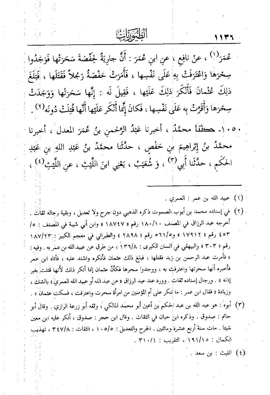 عُمَرَ (¬1) ، عنْ نافِعِ، عنِ ابنِ عُمَرَ: أَنَّ جارِيَةً لِحَفْصَةَ سَحَرَتْها فَوَجَدُوا سِحْرَها وَاعْتَرَفَتْ بِهِ عَلَى نَفْسِها، فَأَمَرَتْ حَفْصَةُ رَجُلاً فَقَتَلَها، فَبَلَغَ ذلِكَ عُثْمانَ فَأَنْكَرَ ذلِكَ عَلَيْها، فَقِيلَ لَه: إِنَّها سَحَرَتْها وَوَجَدَتْ سِحْرَها وَأَقَرَّتْ بِه عَلَى نَفْسِها، فَكانَ إِنَّما أَنْكَرّ عَلَيْها أَنَّها قُتِلَتْ دُونَه (¬2) .