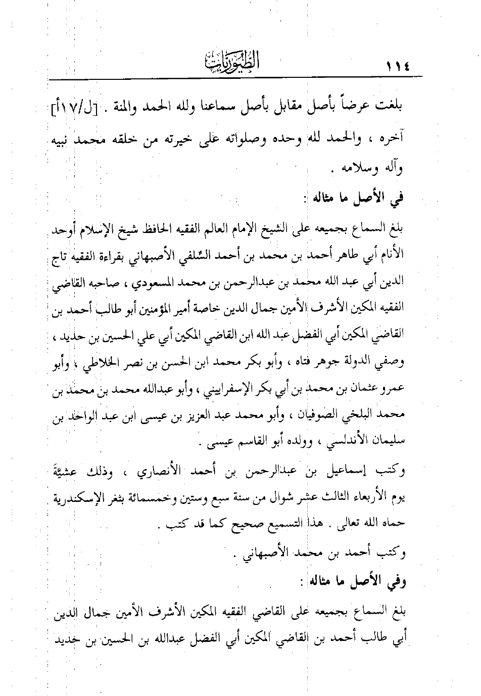 أبي طاهر أحمد بن محمد بن أحمد السِّلفي الأصبهاني بقراءة الفقيه تاج الدين أبي عبد الله محمد بن عبد الرحمن بن محمد المسعودي، صاحبه القاضي الفقيه المكين الأشرف الأمين جمال الدين خاصة أمير المؤمنين أبو طالب أحمد بن القاضي المكين أبي الفضل عبد الله