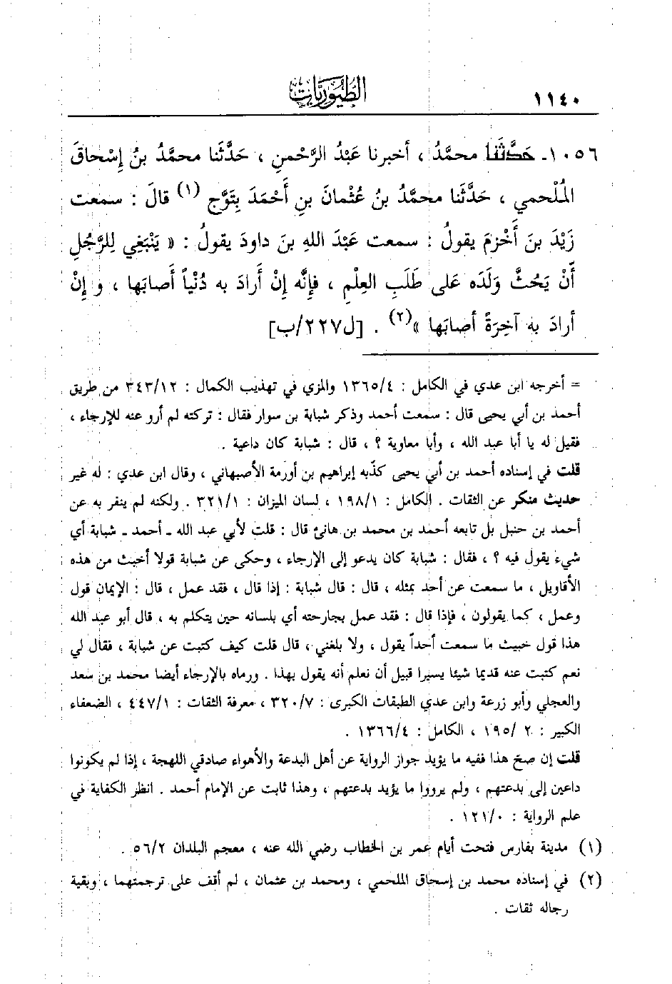 1056 - حَدَّثَنا محمَّدُ، أخبرنا عَبْدُ الرَّحْمنِ، حَدَّثَنا محمَّدُ بنُ إِسْحاقَ الملحمي، حَدَّثَنا محمَّدُ بنُ عُثْمانَ بنِ أَحْمَدَ بِتَوَّج (¬1) قالَ: سَمِعْتُ زَيْدَ بنَ أَخْزمَ يقولُ: سَمِعْتُ عَبْدَ اللهِ بنَ داودَ يقولُ: ((يَنْبَغِي لِلرَّجُلِ أّنْ يَحُثَّ وَلَدَه عَلى طَلَبِ العِلْمِ، فإِنَّه إِنْ أَرادَ به دُنْياً أَصابَها، وإِنْ أرادَ به آخِرَةً أصابَها)) (¬2) . [ل227/ب]