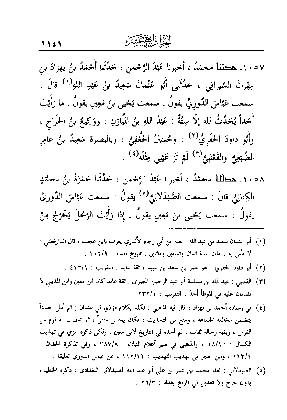 1058 - حدثنا محمَّدُ، أخبرنا عَبْدُ الرَّحْمنِ، حَدَّثَنا حَمْزَةُ بنُ محمَّدٍ الكِنانِيُّ قالَ: سَمِعْتُ الصَّيْدَلانِيَّ (¬5) يقولُ: سَمِعْتُ عَبَّاسَ الدُّورِيَّ يقولُ: سَمِعْتُ يَحْيى بنَ مَعِينٍ يقولُ: إِذا رَأَيْتَ الرَّجُلَ يَخْرُجُ مِنْ