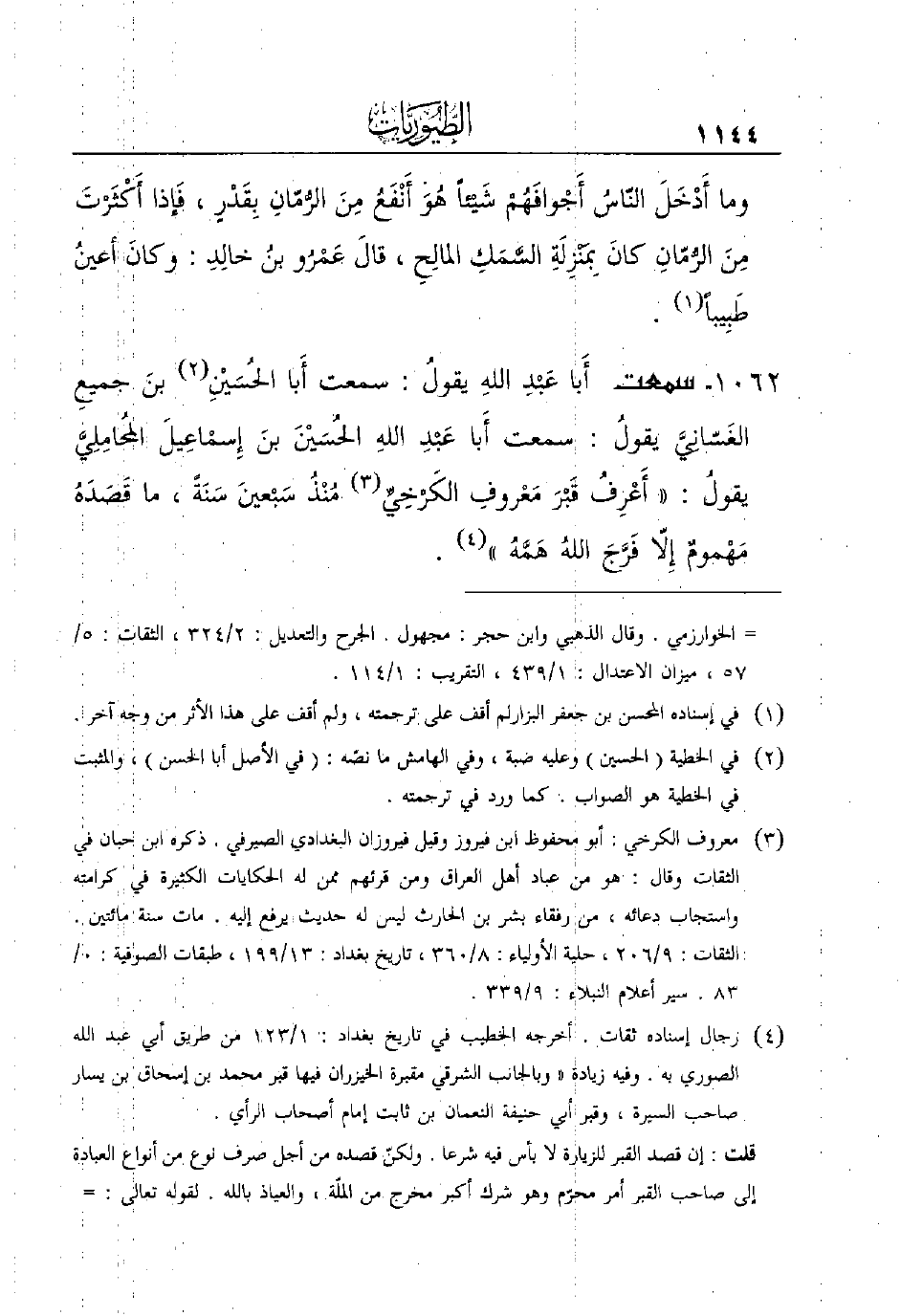 1062 - سَمِعْتُ أَبا عَبْدِ اللهِ يقولُ: سَمِعْتُ أَبا الحُسَيْنِ (¬2) بنَ جميعِ الغَسّانِيَّ يقولُ: سَمِعْتُ أَبا عَبْدِ اللهِ الحُسَيْنَ بنَ إِسمْاعِيلَ المُحامِلِيَّ يقولُ: ((أَعْرِفُ قَبْرَ مَعْروفِ الكَرْخِيِّ (¬3) مُنْذُ سَبْعينَ سَنَةً، ما قَصَدَهُ مَهْمومٌ إِلاّ فَرَّجَ اللهُ هَمَّهُ)) (¬4)