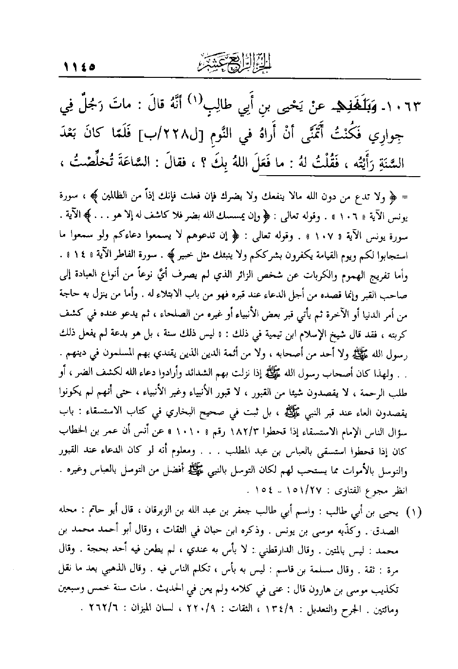 1063- وَبَلَغَنِي عنْ يَحْيى بنِ أَبِي طالِبٍ (¬1) أنَّهُ قالَ: ماتَ رَجُلٌ فِي جِوارِي فَكُنْتُ أَتَمَنَّى أنْ أَراهُ في النَّومِ [ل228/ب] فَلَمّا كانَ بَعْدَ السَّنَةِ رَأَيْتُه، فَقُلْتُ لهُ: ما فَعَلَ اللهُ بِكَ؟، فقالَ: السَّاعَةَ تُخِلِّصْتُ،
