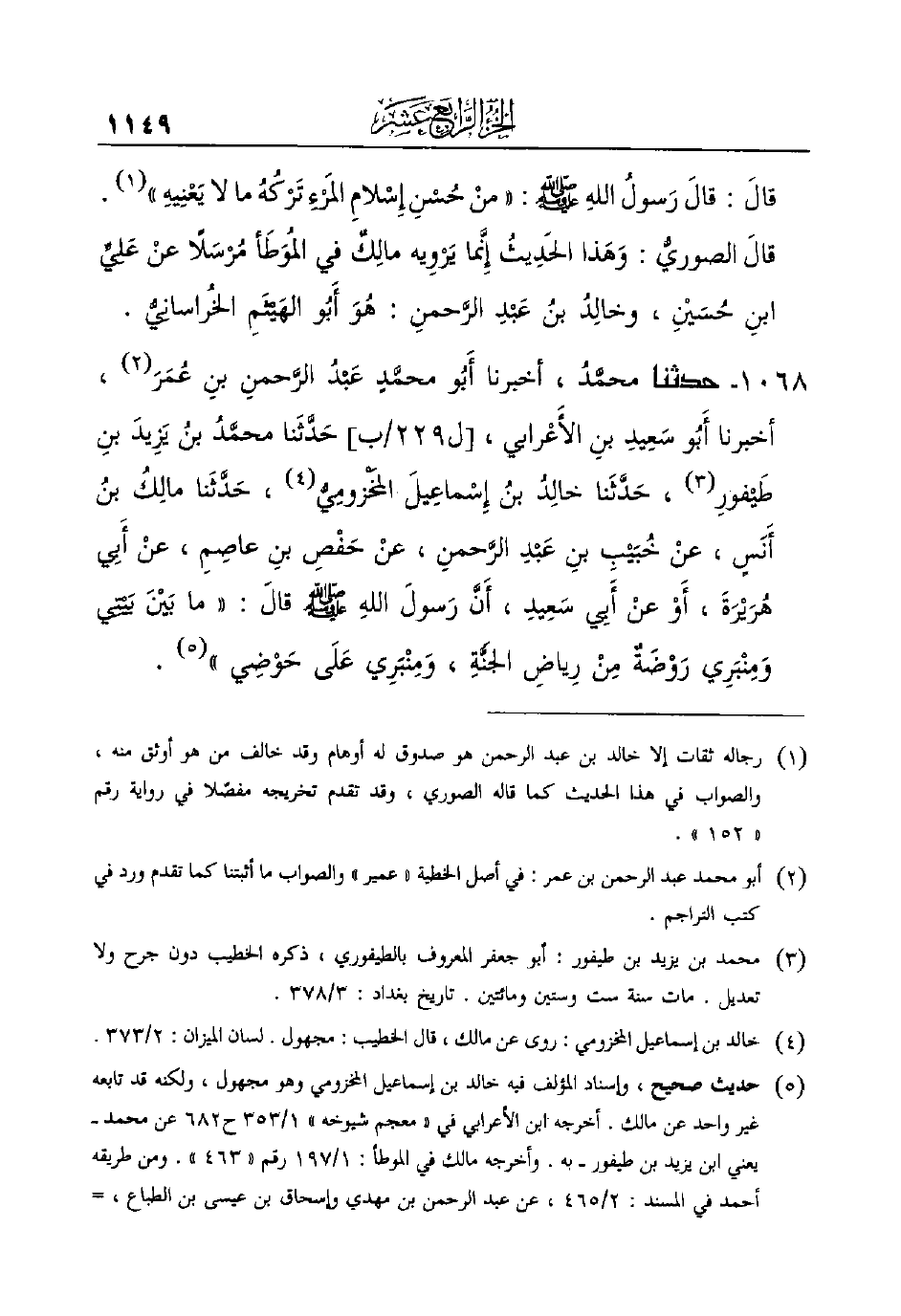 قالَ الصوريُّ: وَهَذا الحَدِيثُ إِنَّما يَرْوِيه مالِكٌ فِي المُوَطَأ مُرْسَلاً عنْ عَلِيِّ بنِ حُسَيْنِ، وخالِدُ ابنُ عَبْدِ الرَّحمنِ: هُوَ أَبُو الهَيْثَمِ الخُراسانِيُّ.