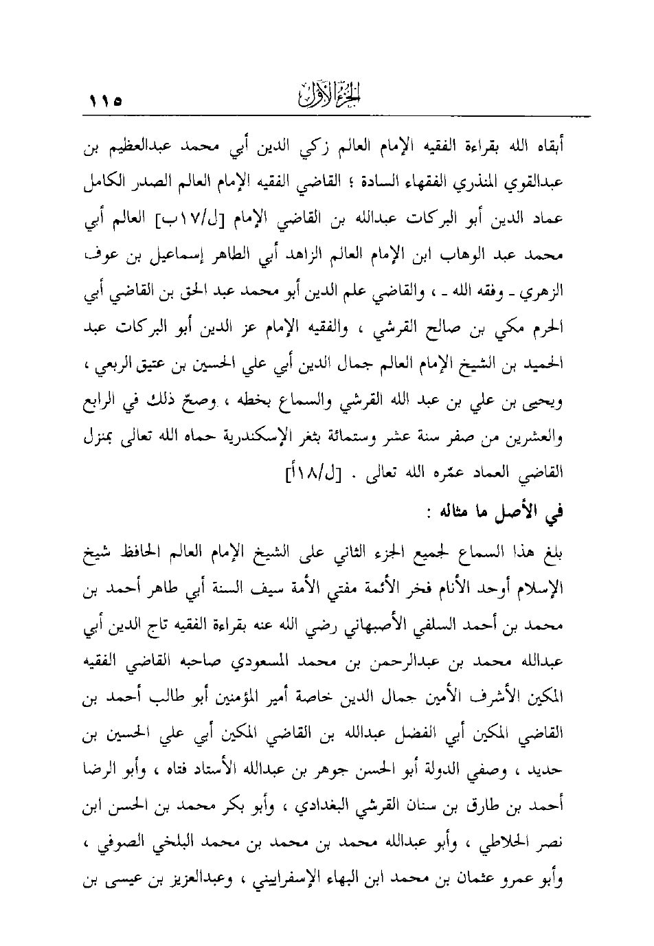أبقاه الله بقراءة الفقيه الإمام العالم زكي الدين أبي محمد عبد العظيم بن عبد القوي المنذري الفقهاء السادة؛ القاضي الفقيه الإمام العالم الصدر الكامل عماد الدين أبو البركات عبد الله بن القاضي الإمام [ل/17ب] العالم أبي محمد عبد الوهاب ابن الإمام العالم الزاهد أبي الطاهر إسماعيل ابن عوف الزهري -وفقه الله-، والقاضي علم الدين أبو محمد عبد الحق بن القاضي