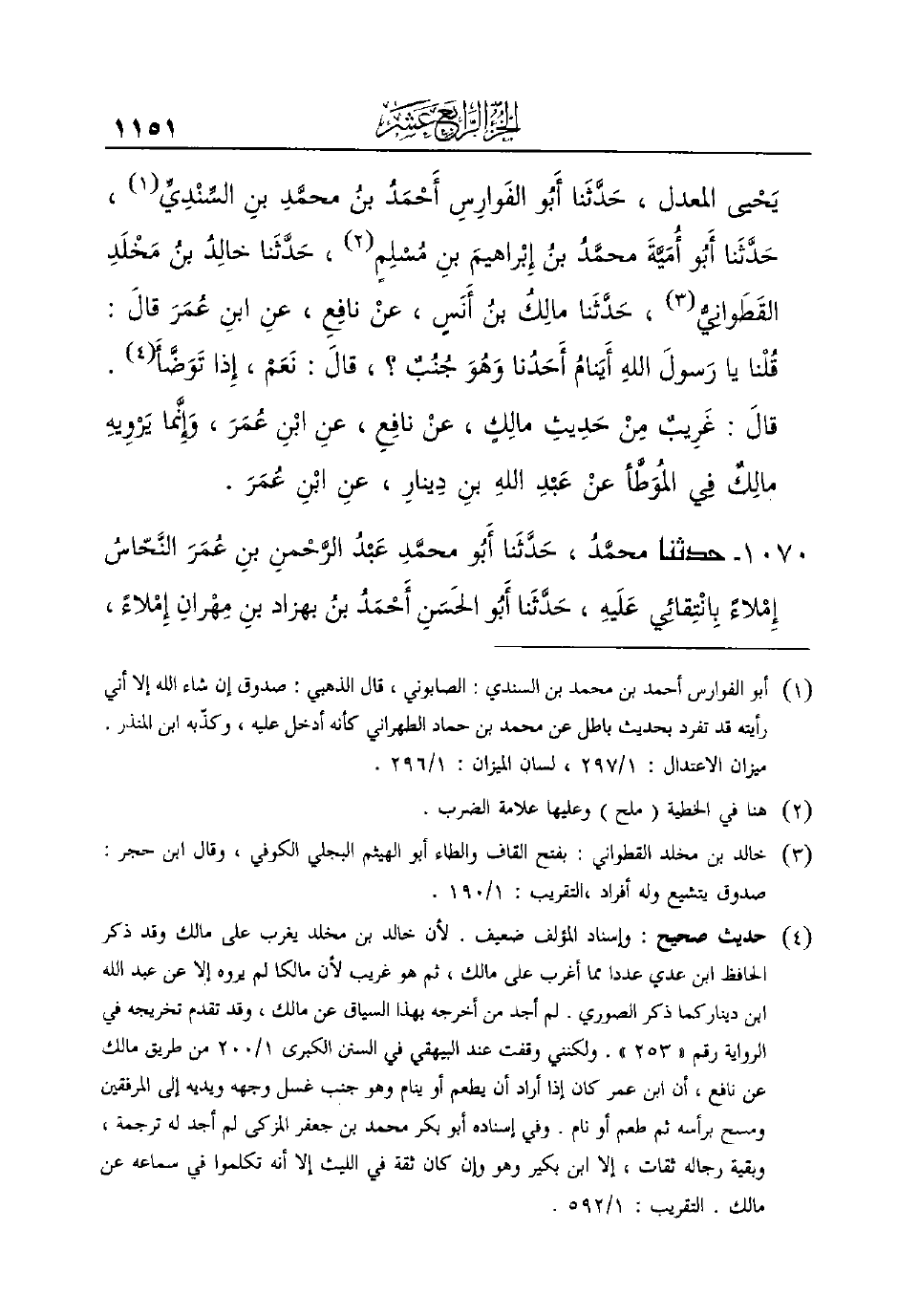 يَحْيى الْمُعَدَّلُ، حَدَّثَنا أَبُو الفَوارِسِ أَحْمَدُ بنُ محمَّدِ بنِ السِّنْدِيِّ (¬1) ، حَدَّثَنا أَبُو أُمَيَّةَ محمَّدُ بنُ إِبْراهيمَ بنِ مُسْلِمٍ (¬2) ، حَدَّثَنا خالِدُ بنُ مَخْلَدِ القَطَوانِيُّ (¬3) ، حَدَّثَنا مالِكُ بنُ أَنَسٍ، عنْ نافِعِ، عنِ ابنِ عُمَرَ قالَ: قُلْنا يَا رَسولَ اللهِ أَيَنامُ أَحَدُنا وَهُوَ جُنُبٌ؟، قالَ: نَعَمْ، إِذا تَوَضَّأَ (¬4) .