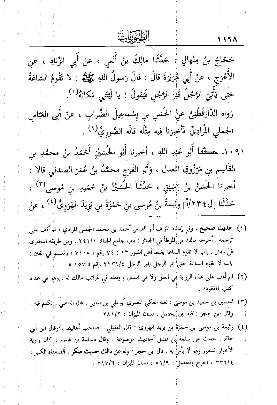 حَجّاجُ بنُ مِنْهالٍ، حَدَّثَنا مالِكُ ابنُ أَنَسٍ، عنْ أَبِي الزِّنادِ، عنِ الأَعْرَجِ، عنْ أَبِي هُرَيْرَةَ قالَ: قالَ رَسولُ اللهِ صَلَّى اللهُ عَلَيْهِ وَسَلَّمَ: لا تَقُومُ السّاعَةُ حَتى يَأْتِيَ الرَّجُلُ قَبْرَ الرَّجُلِ فَيَقولَ: يَا لَيْتَنِي مَكانَهُ (¬1) .