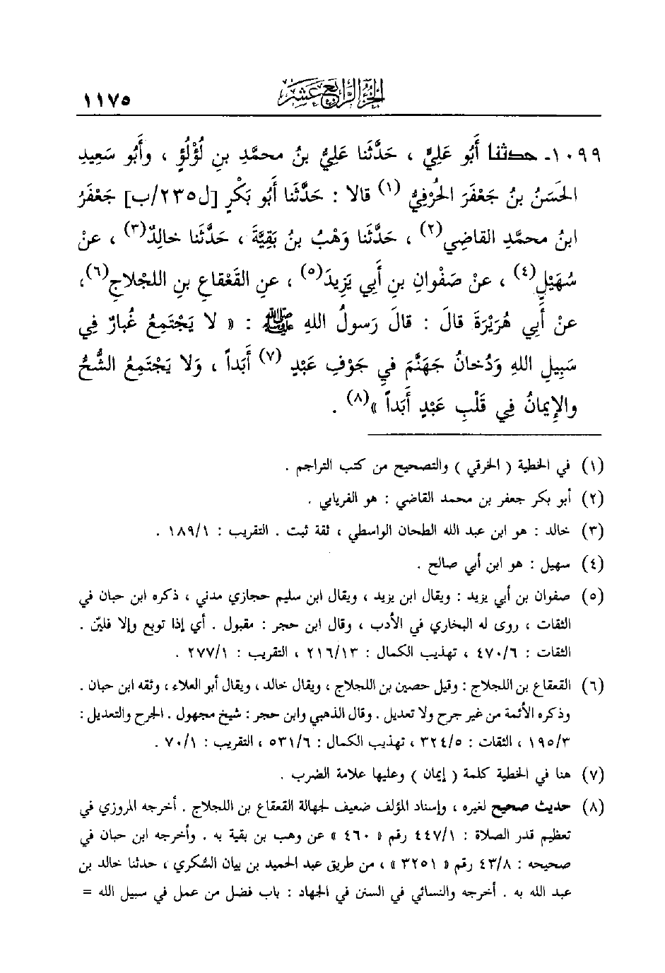ابنِ اللجْلاجِ (¬6) ، عنْ أَبِي هُرَيْرَةَ قالَ: قالَ رَسولُ اللهِ - صَلَّى اللَّهُ عَلَيْهِ وَسَلَّمَ -: ((لا يَجْتَمِعُ غُبارٌ فِي سَبِيلِ اللهِ وَدُخانُ جَهَنَّمَ فيِ جَوْفِ عَبْدٍ (¬7) أَبَداً، وَلا يَجْتَمِعُ الشُّحُّ والإِيمانُ فِي قَلْبِ عَبْدٍ أَبَداً)) (¬8)