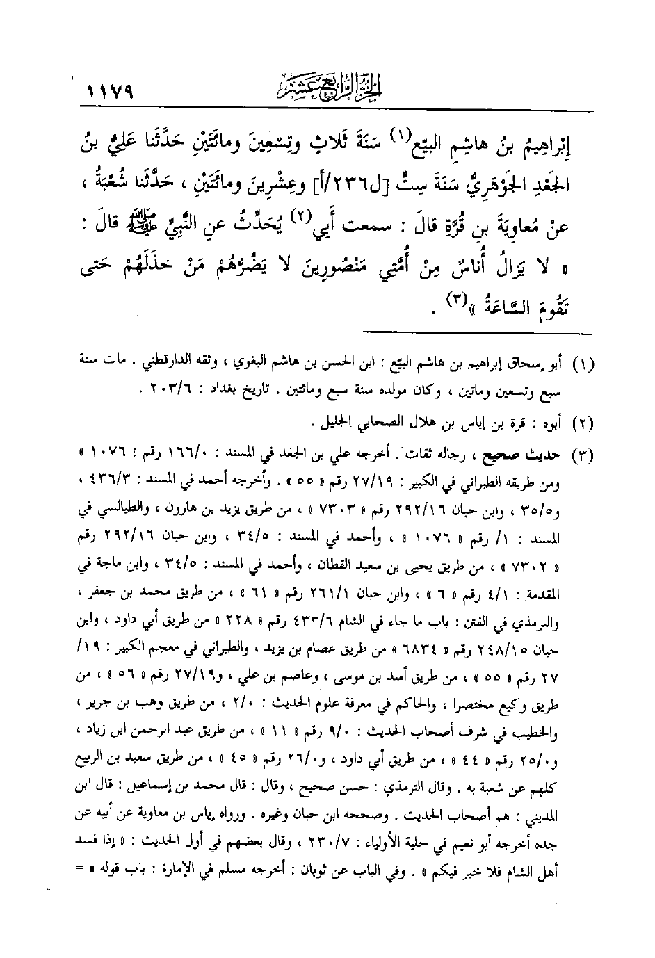 إِبْراهِيمُ ابنُ هاشِمِ الْبَيِّعُ (¬1) سَنَةَ ثَلاثٍ وتِسْعِينَ ومائَتَيْنِ حَدَّثَنا عَلِيُّ بنُ الجَعْدِ الجَوْهَرِيُّ سَنَةَ سِتٍّ [ل236/أ] وعِشْرِينَ ومائَتَيْنِ، حَدَّثَنا شُعْبَةُ، عنْ مُعاوِيَةَ بنِ قُرَّةِ قالَ: سَمِعْتُ أَبِي (¬2) يُحَدِّثُ عنِ النَّبِيِّ صَلَّى اللهُ عَلَيْهِ وَسَلَّمَ قالَ: ((لا يَزالُ أُناسٌ مِنْ أُمَّتِي مَنْصُورِينَ لا يَضُرُّهُمْ مَنْ خَذَلَهُمْ حَتى تَقُومَ السَّاعَةُ)) (¬3)