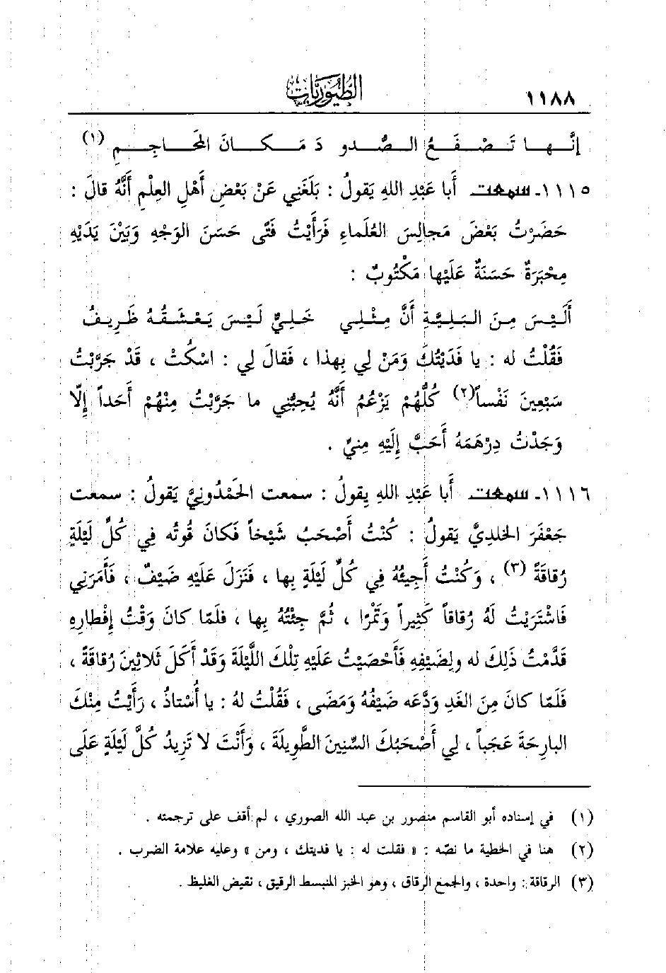1116 - سَمِعْتُ أَبا عَبْدِ اللهِ يِقولُ: سَمِعْتُ الحَمْدُونِيَّ يَقولُ: سَمِعْتُ جَعْفَرَ الخلدِيَّ يَقولُ: كُنْتُ أَصْحَبُ شَيْخاً فَكانَ قُوتُه فِي كُلِّ لَيْلَةٍ رُقاقَةً (¬3) ، وَكُنْتُ أَجِيئُهُ فِي كُلِّ لَيْلَةٍ بِها، فَنَزَلَ عَلَيْهِ ضَيْفٌ، فَأَمَرَنِي فَاشْتَرَيْتُ لَهُ رُقاقاً كَثِيراً وَتَمْرًا، ثُمَّ جِئْتُهُ بِها، فلَمّا كانَ وَقْتُ إِفْطارِهِ قَدَّمْتُ ذَلِكَ له ولِضَيْفِهِ فَأَحْصَيْتُ عَلَيْهِ تِلْكَ اللَّيْلَةَ وَقَدْ أَكَلَ ثَلاثِينَ رُقاقَةً، فَلَمّا كانَ مِنَ الغَدِ وَدَّعَه ضَيْفُهُ وَمَضَى، فَقُلْتُ لهُ يا أُسْتاذُ، رَأَيْتُ مِنْكَ البارِحَةَ عَجَباً، لِي أَصْحَبُكَ السِّنِينَ الطَّوِيلَةَ، وَأَنْتَ لا تَزِيدُ كُلَّ لَيْلَةٍ عَلَى