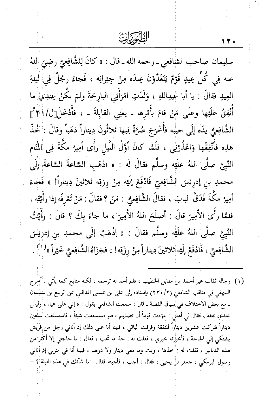 سليمان صاحب الشافعي ـ رحمه الله ـ قال: ((كانَ لِلشَّافِعيّ رضِيَ اللهُ عنه فِي كُلِّ عِيدٍ قَوْمٌ يَتَغَدَّوْنَ عِندَه مِنْ جِيْرانِه، فَجاءَ رجُلٌ فِي ليلةِ العِيدِ فقالَ: يا أبا عبدِاللهِ، وَلَدَتِ امْرَأَتِي البارِحَةَ ولمْ يكُنْ عِندِي ما أُنْفِقُ علَيْها وعلَى مَنْ قامَ بأَمْرِها ـ يعنِي القابِلةَ ـ، فأَدْخَلَ [ل/21أ] الشَّافِعيُّ يدَه إلَى جيبه فأَخْرَجَ صُرَّةً فِيها ثلاثُونَ دِيناراً ذهَباً وقالَ: خُذْ هذِه فأَنْفِقْها وَاعْذُرْنِي، فلَمَّا كانَ أوَّلُ اللَّيلِ رأَى أمِيرُ مكَّةَ فِي المَنَامِ النَّبِيَّ صلَّى اللهُ علَيْه وسلَّم فقالَ لَه: "اذْهَبِ السَّاعةَ السَّاعةَ إلَى محمدِ بنِ إدرِيْسَ الشَّافِعيّ فَادْفَعْ إلَيْه مِنْ رِزقِه ثلاثينَ دِيناراً! " فَجاءَ أمِيرُ مكَّةَ فَدَقَّ البابَ، فقالَ الشَّافِعيُّ: مَنْ؟ فقالَ: مَنْ تَعْرِفُه إذا رأَيْتَه، فلمَّا رأَى الأمِيرَ قالَ: أصلَحَ اللهُ الأمِيرَ، ما جاءَ بِكَ؟ قالَ: رأَيْتُ النَّبِيَّ صلَّى اللهُ علَيْه وسلَّم فقالَ: "اِذْهَبْ إلىَ محمدِ بنِ إدريسَ الشَّافِعيِّ، فَادْفَعْ إلَيْه ثلاثينَ دِيناراً مِنْ رِزْقِه! " فجَزَاهُ الشَّافِعيُّ خَيْراً)) (¬1)