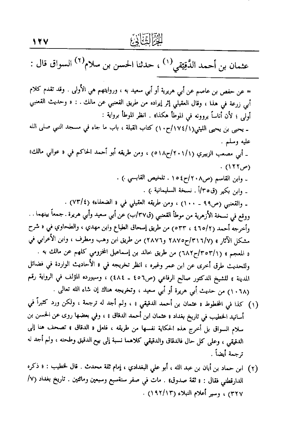 (¬1) كذا في المخطوط "عثمان بن أحمد الدقيقي"، ولم أجد له ترجمة، ولكن ورد كثيراً في أسانيد الخطيب في تاريخ بغداد "عثمان ابن أحمد الدقاق"، وفي بعضها روى عن الحسن بن سلام السواق بل أخرج هذه الحكاية نفسها من طريقه، فلعل "الدقاق" تصحف هنا إلى الدقيقي، وعلى كل حال فالدقاق والدقيقي كلاهما نسبة إلى بيع الدقيق وطحنه، ولم أجد له ترجمة أيضاً.