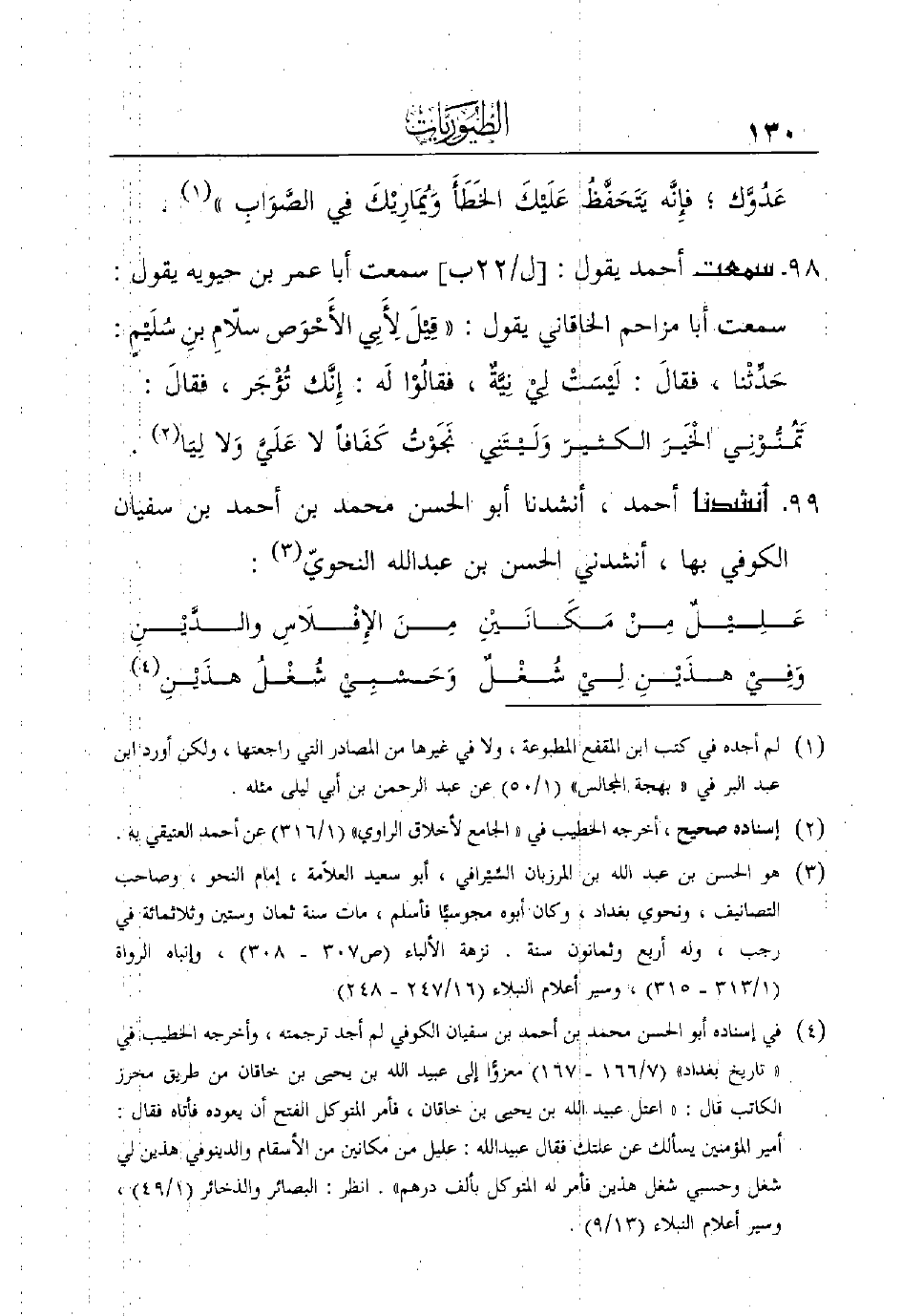 99 - أنشدنا أحمد، أنشدنا أبو الحسن محمد بن أحمد بن سفيان الكوفي بها، أنشدني الحسن بن عبد الله النحوي (¬3) :