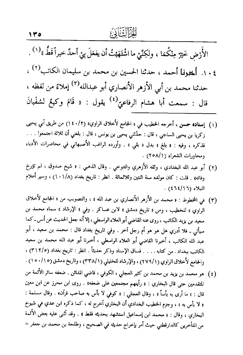 104 - أَخْبَرَنَا أَحْمَدُ، حَدَّثَنَا الْحُسَيْنُ بْنُ محمد بن سليمان الكاتب (¬2) ، حدثنا محمد