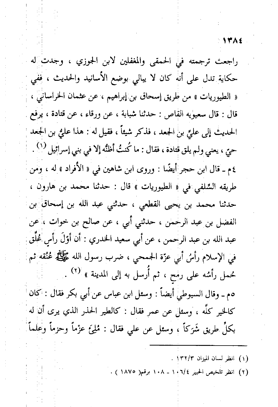 4م- قَالَ ابْنُ حَجَرٍ أَيْضًا: وَرَوَى ابْنُ شَاهِينَ فِي "الأَفْرَادِ" لَهُ، وَمِنْ طَرِيقِهِ السِّلفي فِي "الطُّيُورِيَّاتِ" قَالَ: حَدَّثَنَا مُحَمَّدُ بْنُ هَارُونَ، حَدَّثَنَا مُحَمَّدُ بْنُ يَحْيَى الْقُطَعِيُّ، حَدَّثَنِي عَبْدُ اللَّهِ بْنُ إِسْحَاقَ بْنِ الْفَضْلِ بْنِ عَبْدِ الرَّحْمَنِ، حَدَّثَنِي أَبِي، عَنْ صَالِحِ بْنِ خَوَّاتٍ، عَنْ عَبْدِ اللَّهِ بْنِ عَبْدِ الرَّحْمَنِ، عَنْ أَبِي سَعِيدٍ الْخُدْرِيِّ: أَنَّ أوّلَ رأسٍ عُلِّق فِي الإِسْلامِ رأسُ أَبِي عَزَّةَ الْجُمَحِيِّ، ضَرَبَ رَسُولُ اللَّهِ - صَلَّى اللَّهُ عَلَيْهِ وَسَلَّمَ - عُنُقه ثُمَّ حُمل رأسُه على رمحٍ، ثم اُسل به إلى المدينة» (¬2) .