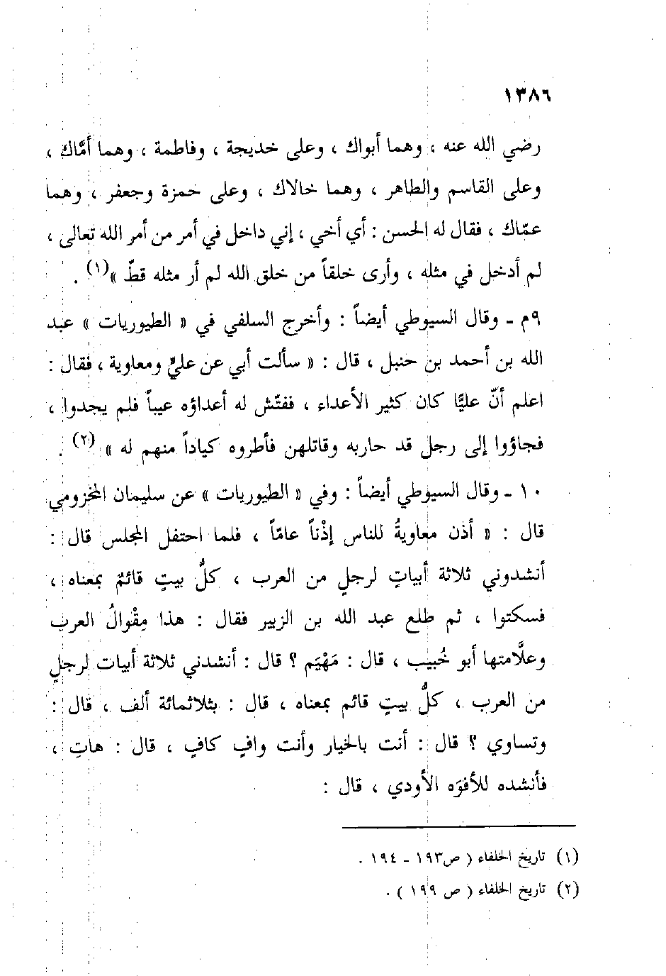 10- وقال السيوطي أيضا: وفي "الطيوريات" عن سليمان المخزومي قال: «أذن معاويةُ للناس إذْناً عاما، فلما احتفل المجلس قال: أنشدوني ثلاثة أبياتٍ لرجلٍ من العرب، كلُّ بيتٍ قائمٌ بمعناه، فسكتوا، ثم طلع عبد الله بن الزبير فقال: هذا مِقْوالُ العرب وعلامتها أبو خُبيب، قال: مَهْيَم؟ قال: أنشدني ثلاثة أبيات لرجلٍ من العرب، كلُّ بيتٍ قائم بمعناه، قال: بثلاثمائة ألف، قال: وتساوي؟ قال: أنت بالخيار وأنت وافٍ كافٍ، قال: هاتِ، فأنشده للأفوَه الأودي، قال: