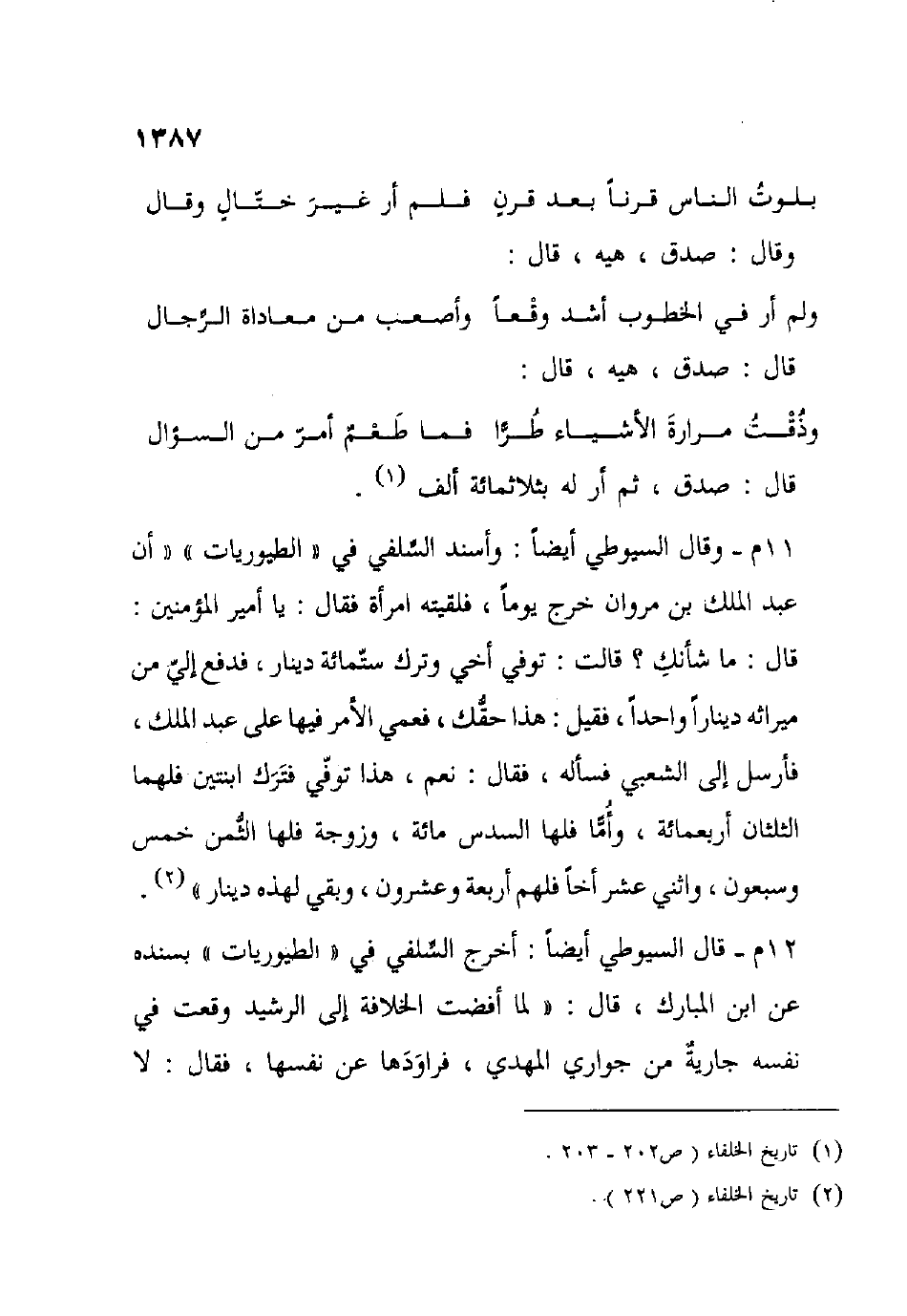 11م- وقال السيوطي أيضا: وأسند السِّلفي في "الطيوريات" «أن عبد الملك بن مروان خرج يوما، فلقيته امرأة فقال: يا أمير المؤمنين: قال: ما شأنكِ؟ قالت: توفي أخي وترك ستّمائة دينار، فدفع إلي من ميراثه دينارا واحدا، فقيل: هذا حقُّك، فعمي الأمر فيها على عبد الملك، فأرسل إلى الشعبي فسأله، فقال: نعم، هذا توفي فترك ابنتين فلهما الثلثان أربعمائة، وأُمًّا فلها السدس مائة، وزوجة فلها الثُّمن خمس وسبعون، واثنى عشر أخا فلهم أربعة وعشرون، وبقي لهذه دينار» (¬2) .