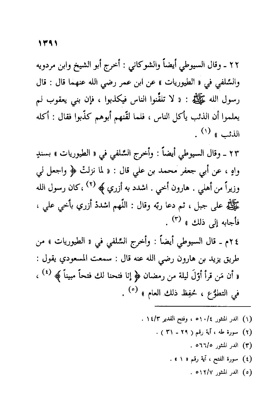 23- وقال السيوطي أيضا: وأخرج السِّلفي في "الطيوريات" بسندٍ واهٍ، عن أبي جعفر محمد بن علي قال: «لما نزلتْ {وَاجْعَلْ لِي وَزِيرًا مِنْ أَهْلِي. هَارُونَ أَخِي. اشْدُدْ بِهِ أَزْرِي} (¬2) ، كَانَ رَسُولُ اللَّهِ - صَلَّى اللَّهُ عليه وسلم - على جبل، ثم دعا ربه وقال: اللهم اشددْ أزري بأخي علي، فأجابه إلى ذلك» (¬3) .