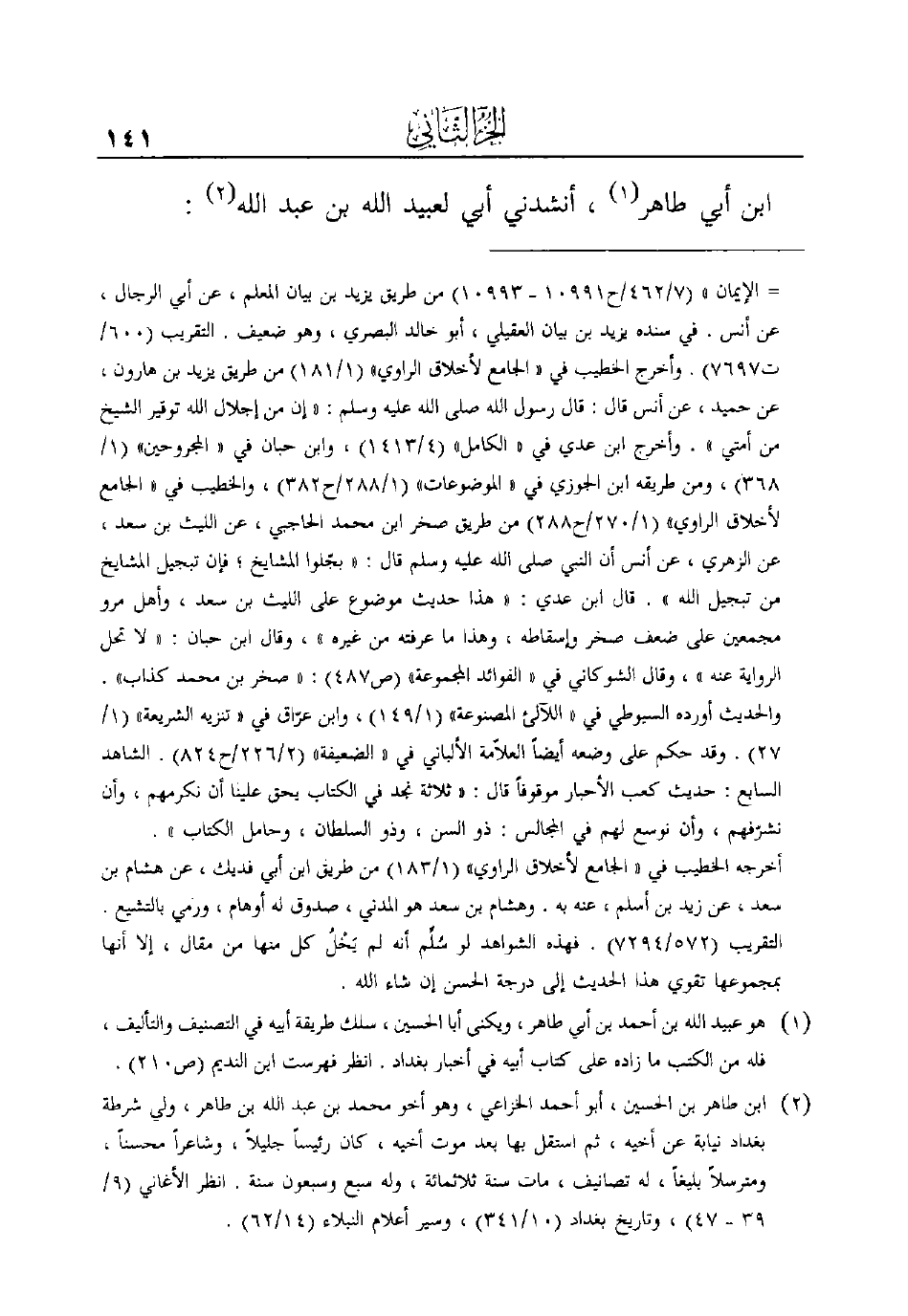 (¬1) هو عبيد الله بن أحمد بن أبي طاهر، ويكنى أبا الحسين، سلك طريقة أبيه في التصنيف والتأليف، فله من الكتب ما زاده على كتاب أبيه في أخبار بغداد.