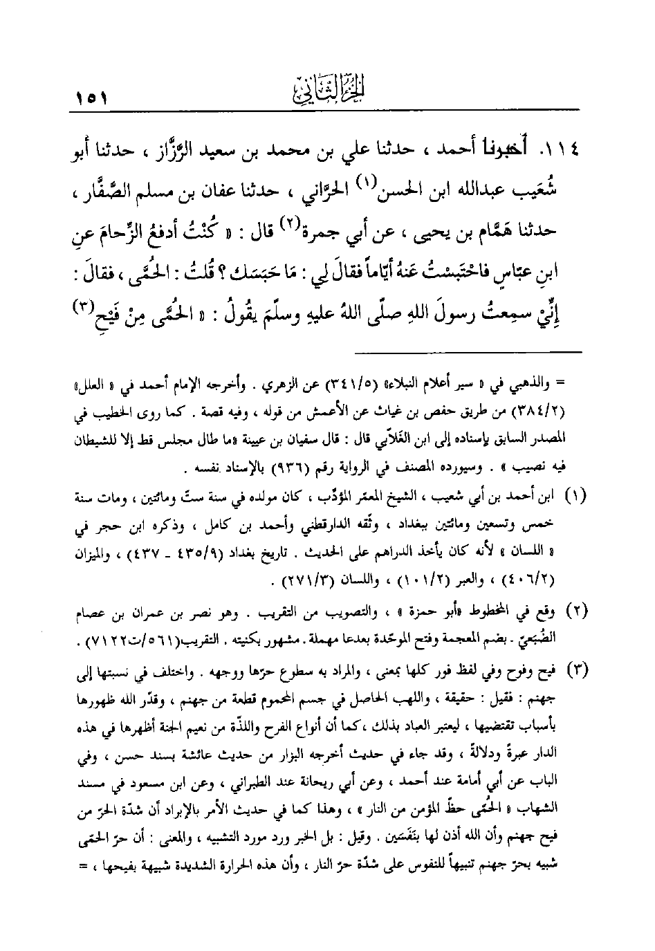 114 - أَخْبَرَنَا أَحْمَدُ، حَدَّثَنَا عَلِيُّ بْنُ مُحَمَّدِ بْنِ سَعِيدٍ الرَّزَّاز، حَدَّثَنَا أبو شُعَيب عبد الله ابن الْحَسَنِ (¬1) الحرَّاني، حَدَّثَنَا عَفَّانُ بْنُ مُسْلِمٍ الصَّفَّار، حَدَّثَنَا هَمَّام بْنُ يَحْيَى،