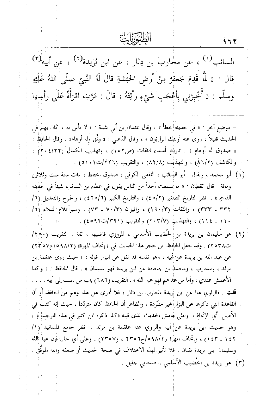 قلت: فالراوي هنا عن ابن بريدة محارب بن دثار، فلا أدري هل هذا وهم من الحافظ أو أن القاعدة التي ذكرها عن البزار غير مطّردة، والظاهر أن الحافظ كان متردّداً، حيث إنه كتب في الأصل ـ أي الإتحاف ـ وعلى هامش الحديث الذي قبله "كذا ذكره ابن كثير في هذه الترجمة"، وهو حديث ابن بريدة عن أبيه والراوي عنه علقمة بن مرثد.