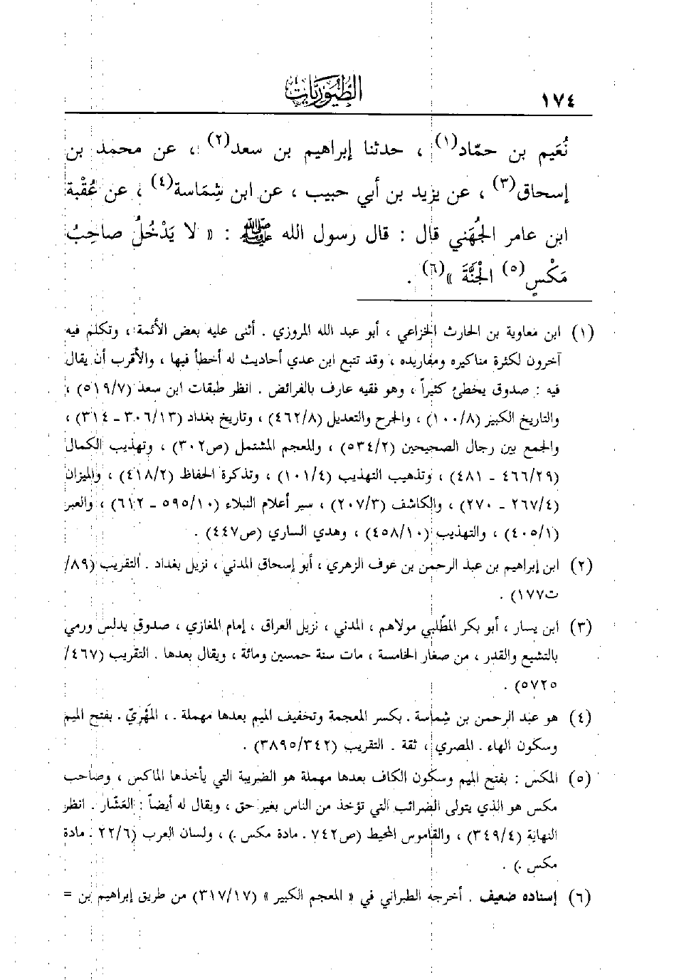 وقع لمحقق كتاب بيان الوهم والإيهام (4/248-249) توهّم، وذلك أن أحمد أخرج في "المسند" (3/14، و83) ، وابن الشجري في "أماليه" حديث أبي سعيد مرفوعاً "لا يدخل الجنة صاحب خمس: مُدْمِن خمر، ولا مؤمن بسحر، ولا قاطع رحم، ولا كاهن ولا منّان"، فتصحّف لديه كلمة "خمس" إلى "مكس"، فظن أن الحديث شاهد لحديثنا، وليس الأمر كما قال، فليتأمّل.