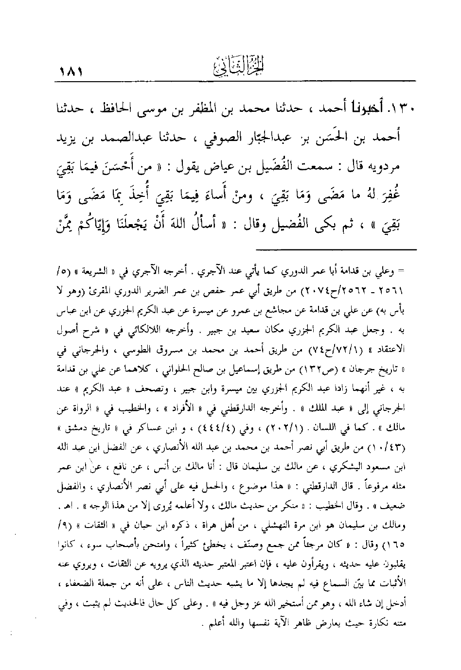 ابن عبد الجبّار الصوفي، حدثنا عبد الصمد بن يزيد مردويه قال: سمعت الفُضَيل بن عياض يقول: ((من أَحْسَنَ فيمَا بَقِيَ غُفِرَ لهُ ما مَضَى وَمَا بَقِيَ، ومنْ أَساءَ فِيمَا بَقِيَ أُخِذَ بِمَا مَضَى وَمَا بَقِيَ)) ، ثم بكى الفُضيل وقال: ((أسألُ اللهَ أَنْ يَجْعلَنَا وَإِيّاكُمْ مِمَّنْ