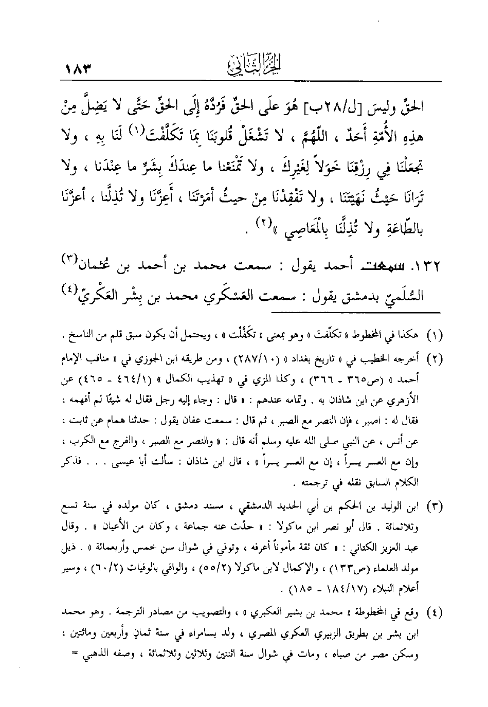 الحقِّ وليسَ [ل/28ب] هُوَ علَى الحقِّ فَرُدَّهُ إِلَى الحقِّ حَتَّى لا يَضِلَّ مِنْ هذِهِ الأُمّةِ أَحَدٌ، اللهُمَّ، لا تَشْغَلْ قُلوبَنَا بِمَا تَكَلَّفْتَ (¬1) لَنَا بِهِ، ولا تجعَلْنَا فِي رِزْقِنَا خَوَلاً لِغَيْرِكَ، ولا تَمْنَعْنا ما عِندَكَ بِشَرِّ ما عِنْدَنا، ولا تَرَانَا حَيْثُ نَهَيْتَنَا، ولا تَفْقِدْنَا مِنْ حيثُ أمَرْتَنَا، أَعِزَّنَا ولا تُذِلَّنا، أعزَّنَا بالطّاعَةِ ولا تُذِلَّنَا بِالْمَعَاصِي")) (¬2) .