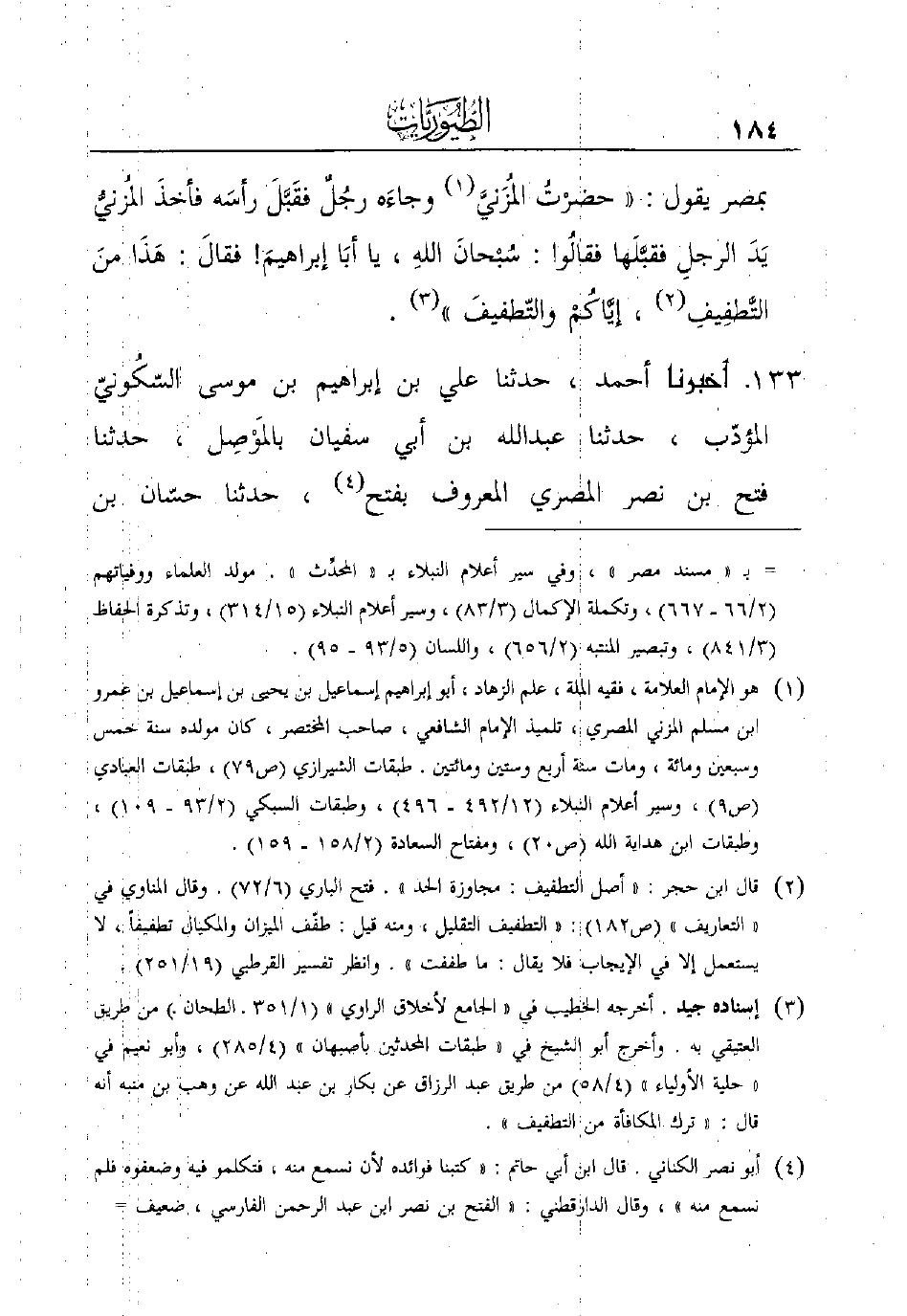 بمصر يقول: ((حضرْتُ المُزَنيَّ (¬1) وجاءَه رجُلٌ فقَبَّلَ رأسَه فأخذَ المُزنيُّ يَدَ الرجلِ فقبَّلَها فقالُوا: سُبْحانَ اللهِ، يا أبَا إبراهيمَ! فقالَ: هَذَا منَ التَّطفِيفِ (¬2) ، إيَّاكُمْ والتّطفيفَ)) (¬3) .