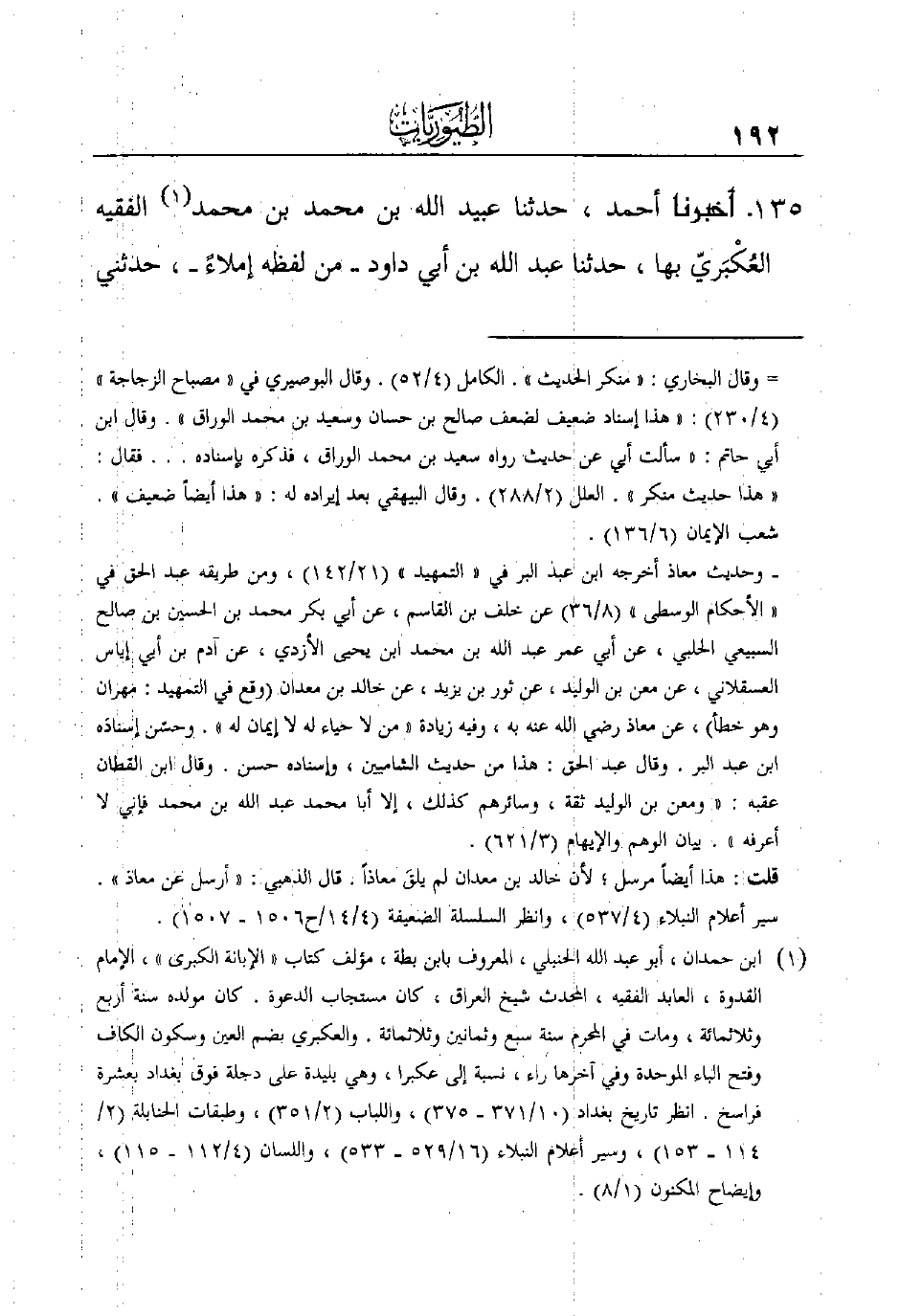 135 - أَخْبَرَنَا أَحْمَدُ، حَدَّثَنَا عُبَيْدُ اللَّهِ بْنُ مُحَمَّدِ بْنِ مُحَمَّدٍ (¬1) الْفَقِيهُ العُكْبَريّ بِهَا،
