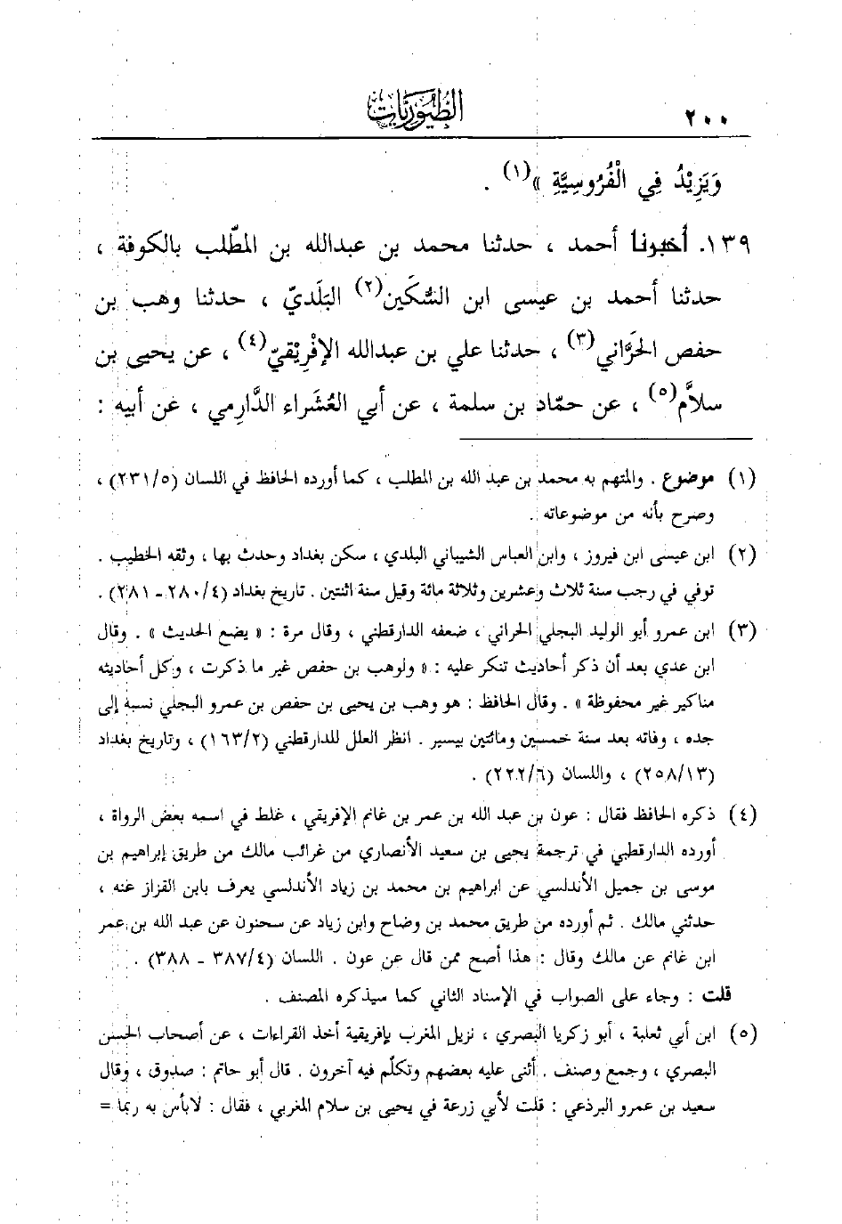 139 - أَخْبَرَنَا أَحْمَدُ، حَدَّثَنَا مُحَمَّدُ بْنُ عبد الله بْنِ الْمُطَّلِبِ بِالْكُوفَةِ، حَدَّثَنَا أَحْمَدُ بن عيسى ابن السُّكَين (¬2) البَلَديّ، حَدَّثَنَا وَهْبُ بْنُ حَفْصٍ الحَرَّاني (¬3) ، حَدَّثَنَا عَلِيُّ بْنُ عبد الله الإفْرِيْقيّ (¬4) ، عَنْ يَحْيَى بْنِ سلاَّم (¬5)