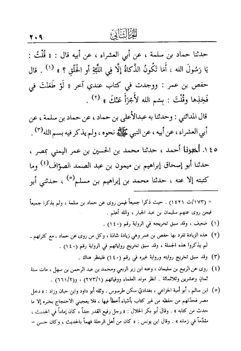 (¬2) هذه الزيادة تفرد بها حفص بن عمر وهي زيادة شاذة، وكل من روى عن حماد -مع كثرتهم- لم يذكروا هذه الجملة، وقد سبق تخريج رواياتهم في الرواية رقم (140) .