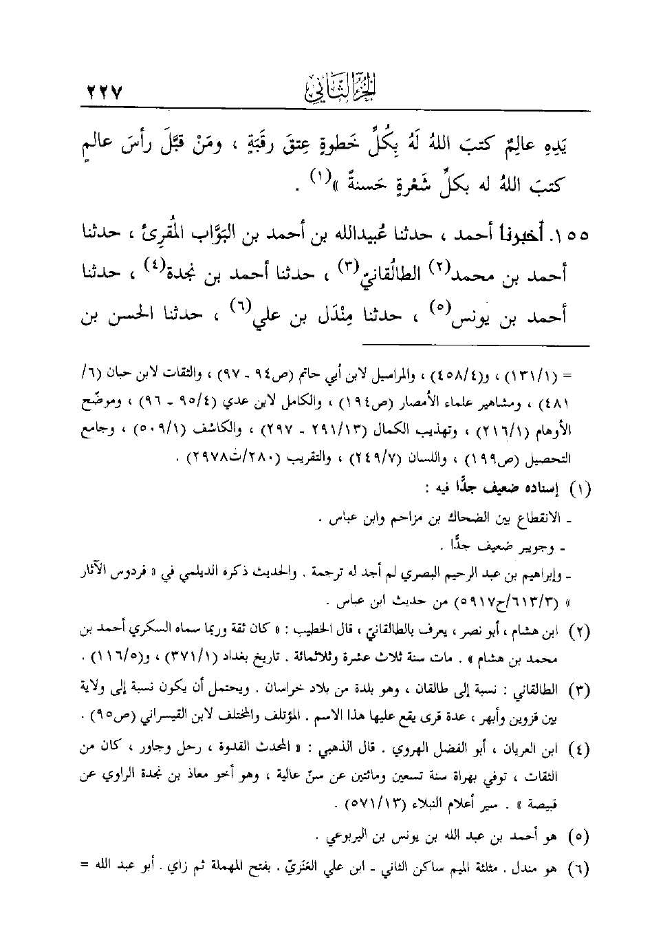 155 - أَخْبَرَنَا أحمد، حدثنا عُبيدالله بْنُ أَحْمَدَ بْنِ البَوَّاب المُقرِئ، حَدَّثَنَا أَحْمَدُ بْنُ مُحَمَّدٍ (¬2) الطالُقانيّ (¬3) ، حَدَّثَنَا أَحْمَدُ بْنُ نَجْدَةَ (¬4) ، حَدَّثَنَا أَحْمَدُ بْنُ يُونُسَ (¬5) ، حَدَّثَنَا مِنْدَل بْنُ عَلِيٍّ (¬6)