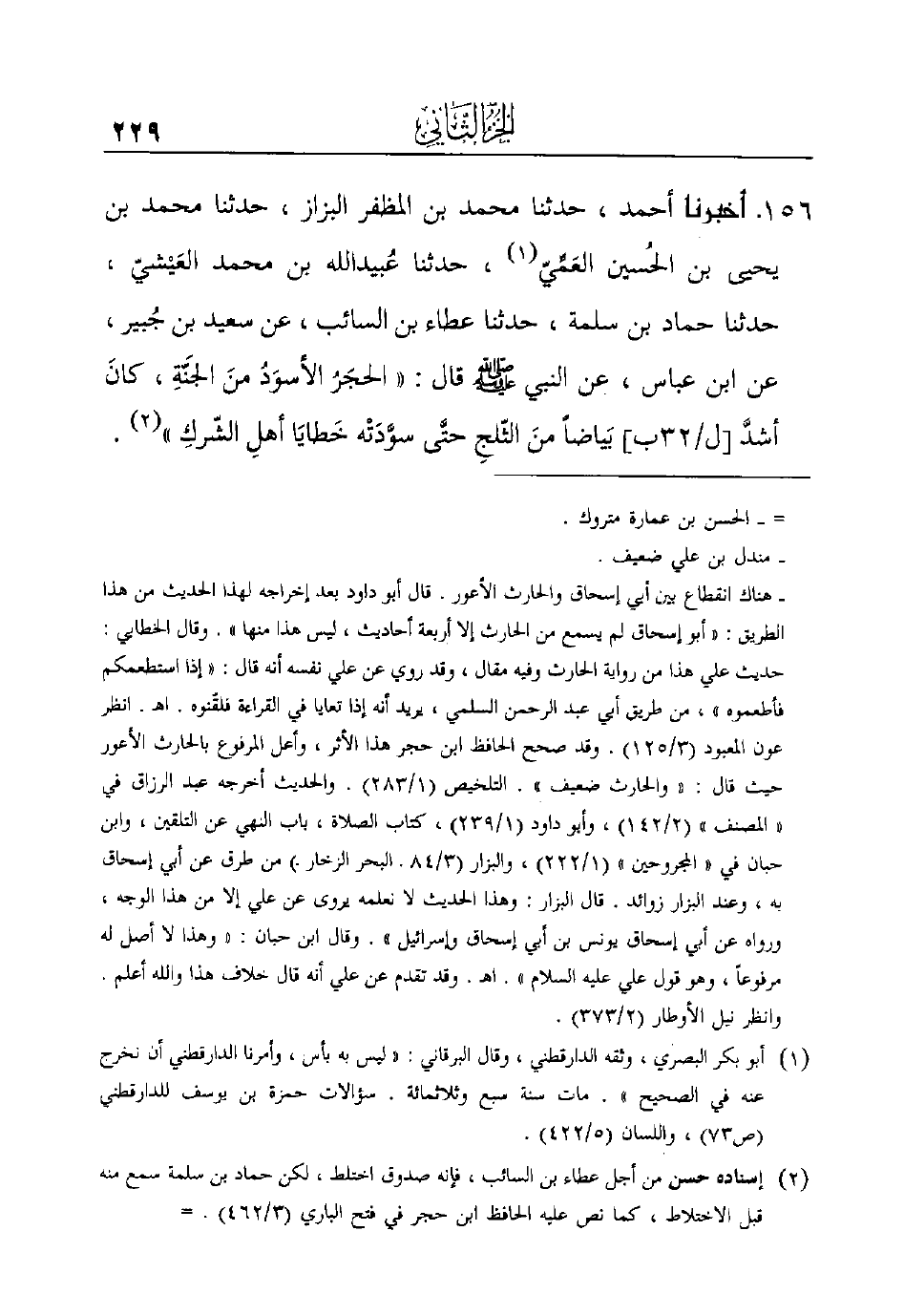 156 - أَخْبَرَنَا أَحْمَدُ، حَدَّثَنَا مُحَمَّدُ بْنُ الْمُظَفَّرِ الْبَزَّازُ، حَدَّثَنَا مُحَمَّدُ بْنُ يَحْيَى بْنِ الحُسين العَمِّيّ (¬1) ، حَدَّثَنَا عُبيدالله بْنُ مُحَمَّدٍ العَيْشيّ، حَدَّثَنَا حَمَّادُ بْنُ سَلَمَةَ، حَدَّثَنَا عَطَاءُ بْنُ السائب، عن سعيد بن جُبير، عَنِ ابْنِ عَبَّاسٍ، عَنِ النَّبِيِّ صَلَّى اللَّهُ عَلَيْهِ وَسَلَّمَ قَالَ: ((الحجَرُ الأسوَدُ منَ الجَنّةِ، كانَ أشدَّ [ل/32ب] بَياضاً منَ الثّلجِ حتَّى سوَّدَتْه خَطايَا أهلِ الشّركِ)) (¬2) .