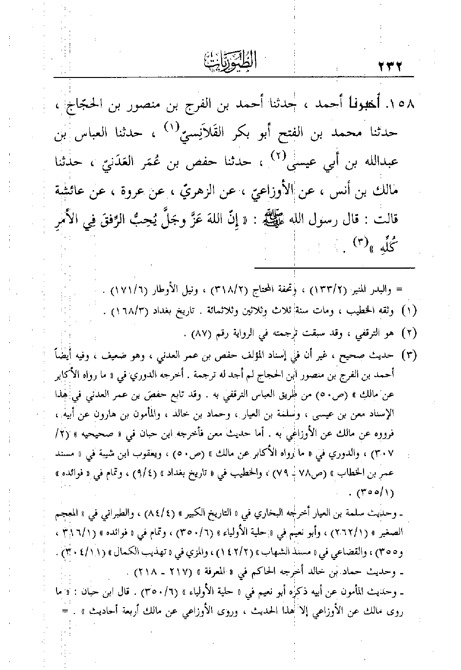 ابن عُمَر العَدَنيّ، حَدَّثَنَا مَالِكُ بْنُ أَنَسٍ، عَنِ الأَوْزَاعِيِّ، عَنِ الزُّهْرِيِّ، عَنْ عُرْوَةَ، عَنْ عَائِشَةَ قَالَتْ: قَالَ رَسُولُ اللَّهِ صَلَّى اللَّهُ عَلَيْهِ وَسَلَّمَ: ((إِنّ اللهَ عَزَّ وجَلَّ يُحِبُّ الرِّفقَ فِي الأمرِ كُلِّهِ)) (¬3)