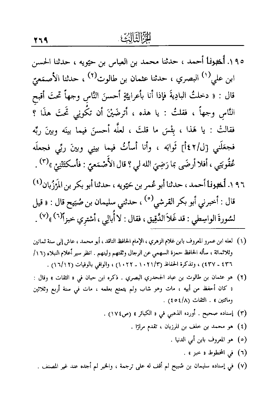 196 - أخبرنا أحمد، حَدَّثَنَا أَبُو عُمر بْنِ حَيّويه، حَدَّثَنَا أَبُو بَكْرِ بن المَرْزُبان (¬4) قال: أخبرني أبو بكر القرشي (¬5) ، حدثني سليمان بن صُبَيح قال: ((قيل لسُورةَ الواسِطي: قد غَلاَ الدَّقِيق، فقال: لا أُبالِي، أشترِي خبزاً (¬6)) ) (¬7) .