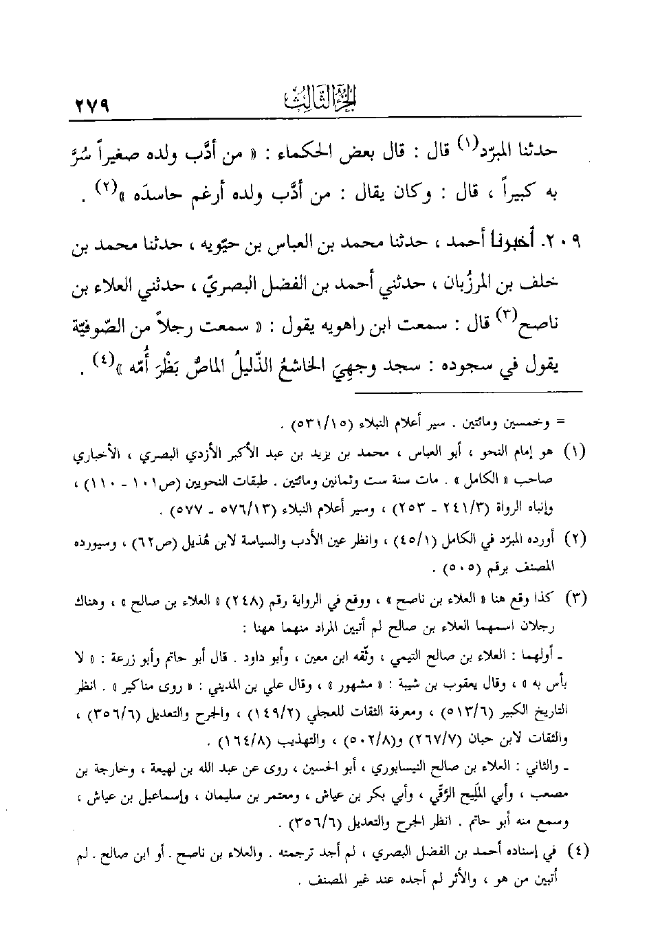 209 - أَخْبَرَنَا أَحْمَدُ، حَدَّثَنَا مُحَمَّدُ بْنُ العباس بن حيويه، حدثنا محمد بن خلف بن المرزُبان، حدثني أحمد بن الفضل البصري، حدثني العلاء بن ناصح (¬3)