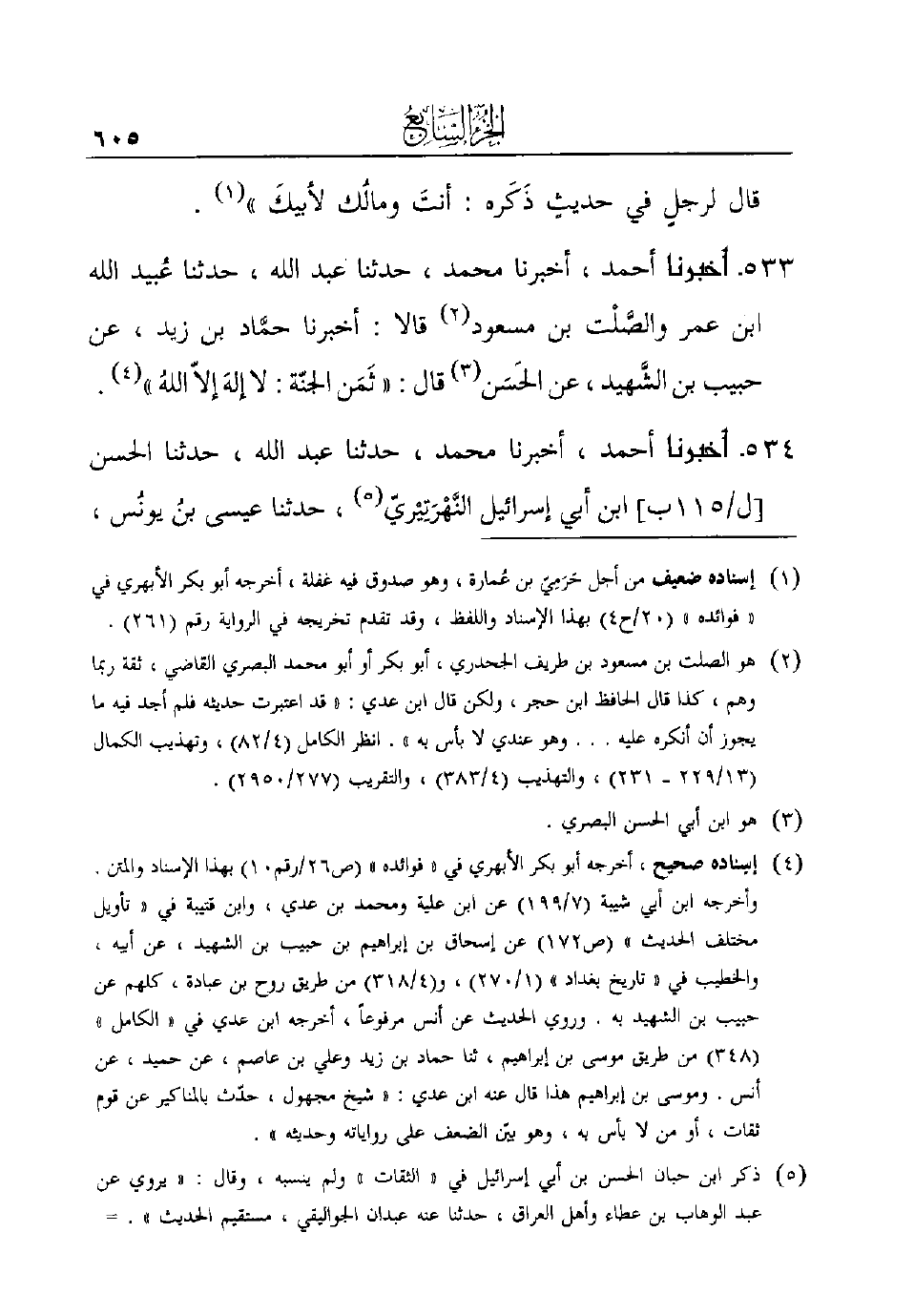 533 - أخبرنا أحمد، أخبرنا محمد، حدثنا عبد الله، حدثنا عُبيد الله بن عمر والصَّلْت ابن مسعود (¬2) قالا: أخبرنا حمَّاد بن زيد، عن حبيب بن الشَّهيد، عن الحَسَن (¬3) قال: ((ثَمَن الجنة: لا إلهَ إِلا اللهُ)) (¬4) .
