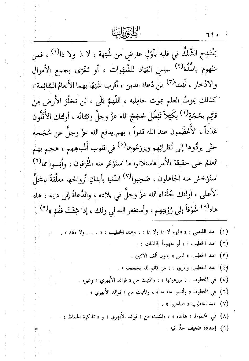 ، فمن مَنْهوم باللَّذَّة (¬2) سلِسِ القِيَاد للشَّهَوات، أو مُغْرًى بجمع الأموال والادِّخار، لَيْسَا (¬3) من دُعاة الدين، أقرب شَبَهًا بهما الأنعامُ السَّائِمة، كذلك يموتُ العلم بموت حامِليه، اللهمَّ بَلَى، لن تخلُوَ الأرض مِنْ قائِمٍ بحُجّةٍ (¬4) لِكَيْلاَ تَبْطُلَ حُجَجُ الله عزَّ وجلَّ وبَيِّناتُه، أولئك الأَقَلُّون عَدَداً، الأَعْظَمون عند الله قدرا، بهم يدفع الله عزَّ وجلَّ عن حُجَجه حتَّى يردُّوها إلى نُظرائِهم ويزرَعُوها (¬5) في قلوب أَشْباهِهم، هجم بهم العلمُ على حقيقة الأمر فاستلانوا ما استَوْعَر منه المُتْرَفون، وأنِسوا مما (¬6) استَوْحَش منه الجاهلون، صَحِبوا (¬7) الدنيا بأبدانٍ أرواحُها معلَّقةٌ بالمحلِّ الأعلى، أولئك خُلَفاء الله عزَّ وجلَّ في بلاده، والدُّعاةُ إلى دينِه، هاه هاه (¬8) شَوْقاً إلى رُؤيتِهم، وأستغفر الله لي ولك، إذا شِئْتَ فقُمْ)) (¬9)