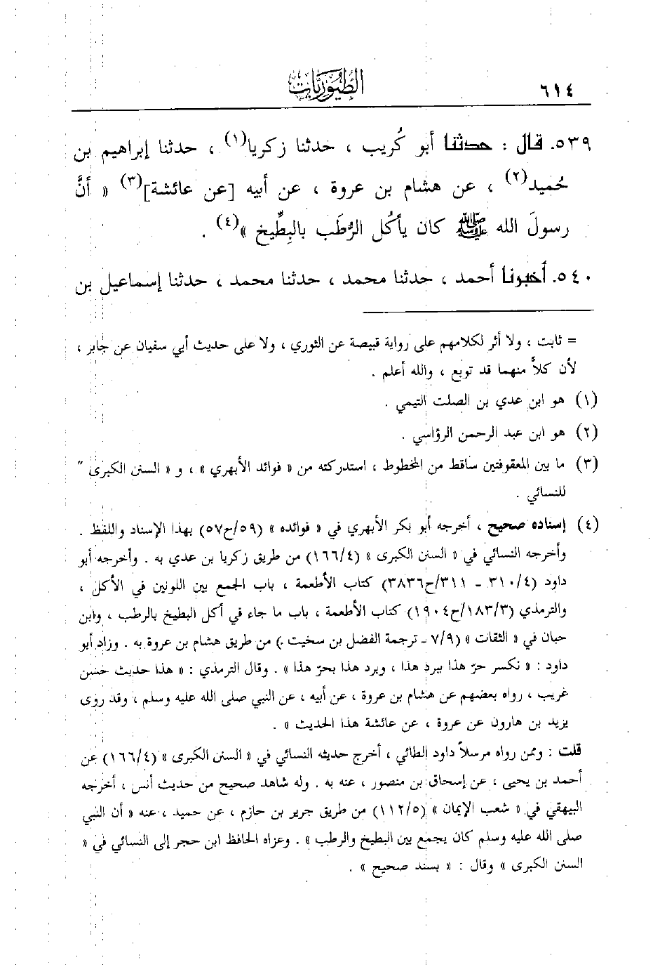 539 - قَالَ: حَدَّثَنَا أَبُو كُريب، حَدَّثَنَا زَكَرِيَّا (¬1) ، حَدَّثَنَا إِبْرَاهِيمُ بْنُ حُميد (¬2) ، عَنْ هِشَامِ بْنِ عُرْوَةَ، عَنْ أَبِيهِ [عَنْ عَائِشَةَ] (¬3) ((أنَّ رسولَ اللَّهِ صَلَّى اللَّهُ عَلَيْهِ وَسَلَّمَ كَانَ يأكُل الرُّطَب بالبِطِّيخ)) (¬4) .