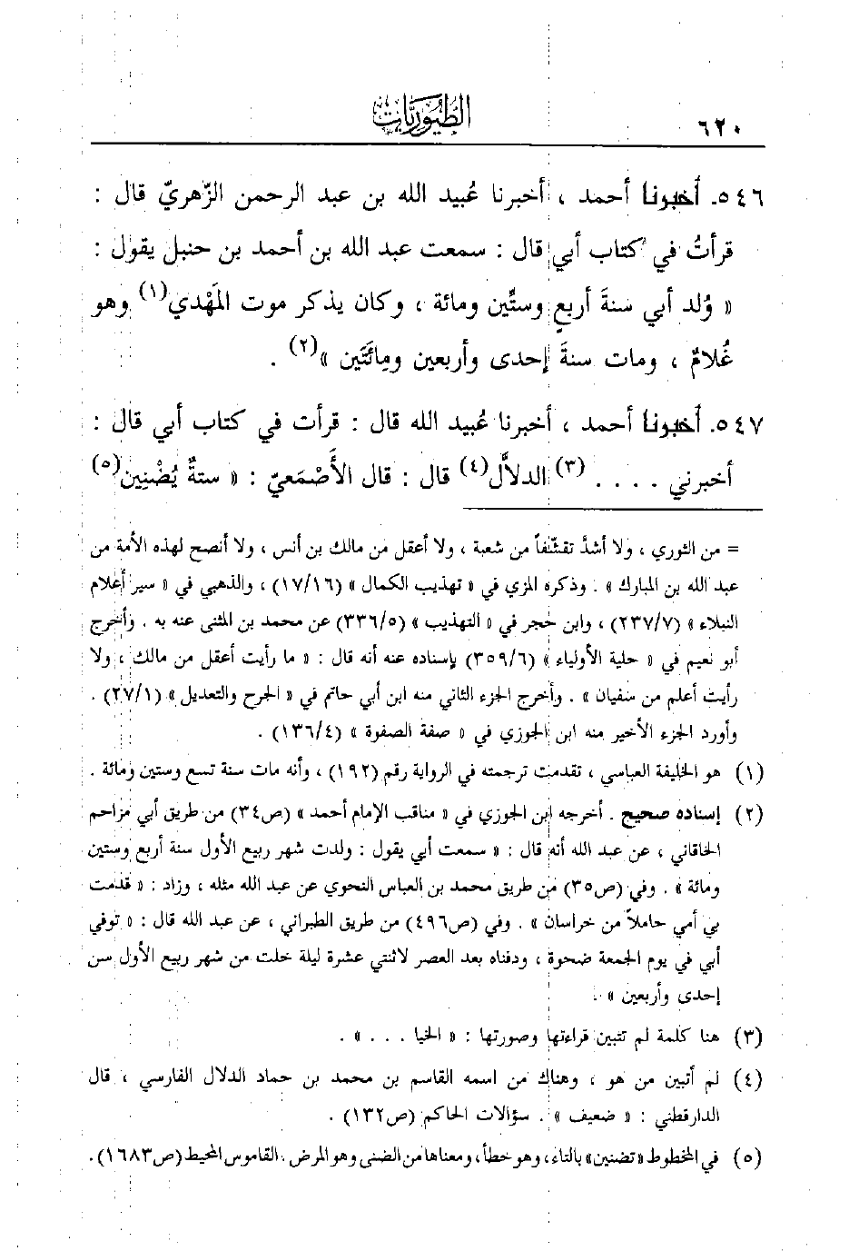 546 - أخبرنا أحمد، أخبرنا عُبيد الله بن عبد الرحمن الزهري قال: قرأتُ في كتاب أبي قال: سمعت عبد الله بن أحمد بن حنبل يقول: ((وُلد أبي سنةَ أربعٍ وستِّين ومائة، وكان يذكر موت المَهْدي (¬1) وهو غُلامٌ، ومات سنةَ إحدى وأربعين ومِائَتَين)) (¬2) .