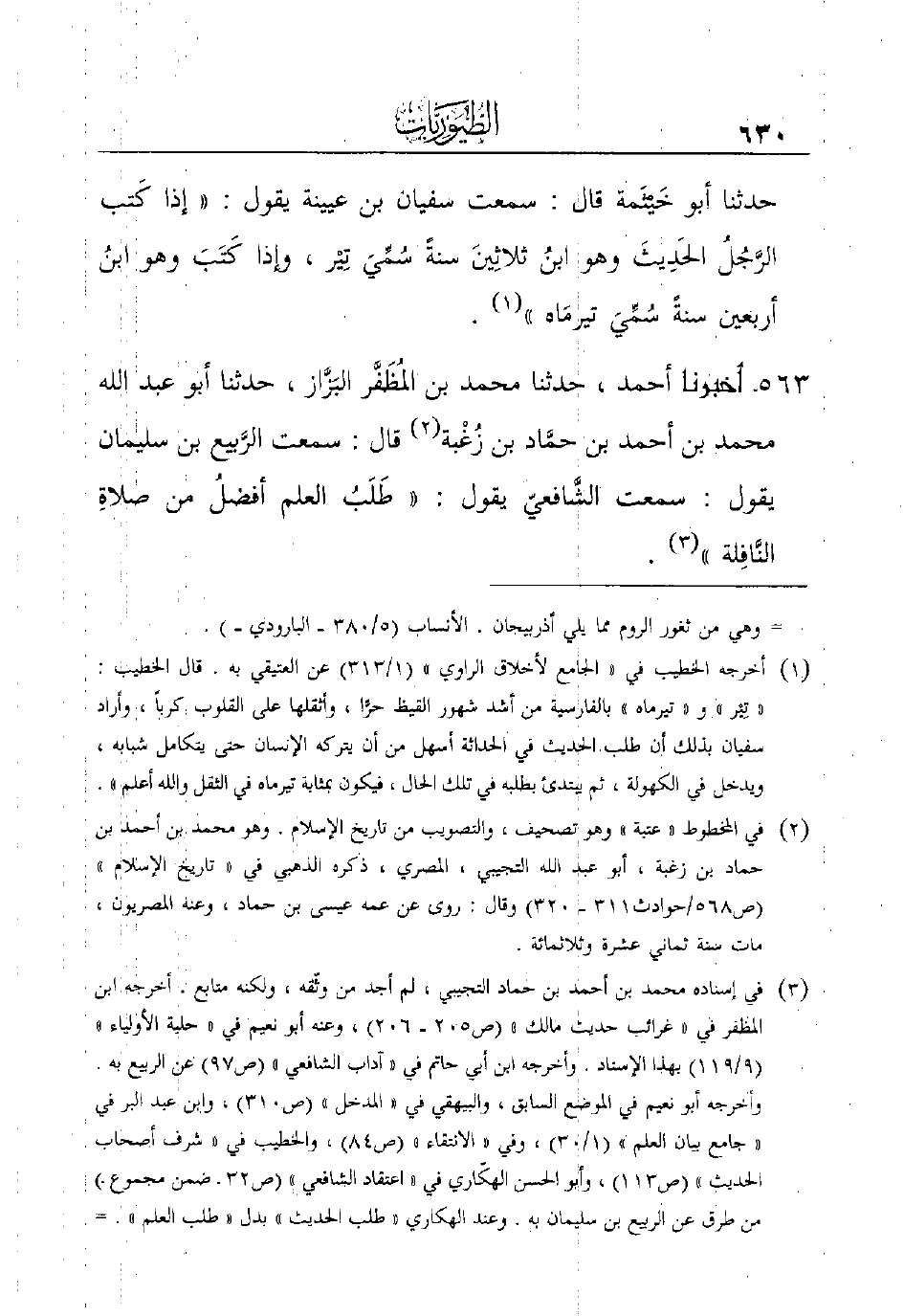 563 - أَخْبَرَنَا أَحْمَدُ، حَدَّثَنَا مُحَمَّدُ بْنُ المُظَفَّر البَزَّاز، حدثنا أَبُو عَبْدِ اللَّهِ مُحَمَّدُ بْنُ أحمد ابن حمَّاد بن زُغْبة (¬2) قال: سمعت الرَّبيع بن سليمان يقول: سمعت الشَّافعيّ يقول: ((طَلَبُ العلم أفضلُ من صلاةِ النَّافِلة)) (¬3) .